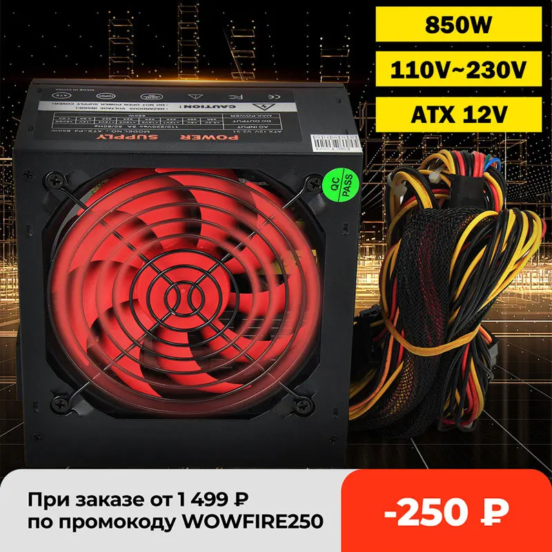 Блок питания для ПК, бесшумный светодиодный вентилятор 12 см, 850 Вт, 110 230 В, 12 В, 24 контакта, ATX, PCI 6, SATA, Active PFC, Intel, AMD, для настольного компьютера