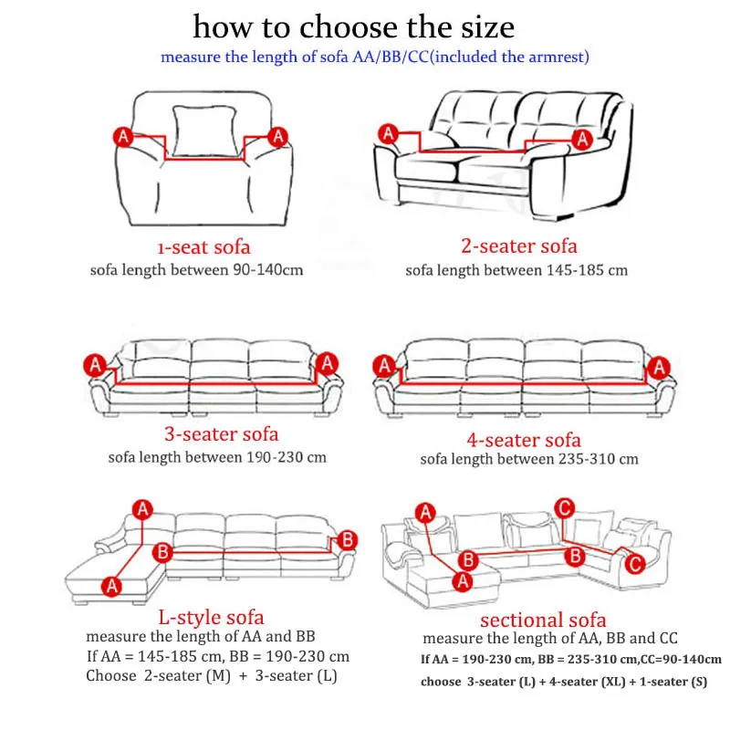 3)L-образный диван: Измерьте длину линий AA и BB (с подлокотниками) 4) секционный диван: Измерьте длину линий AA и BB или CC (требуется 3 шт.)
