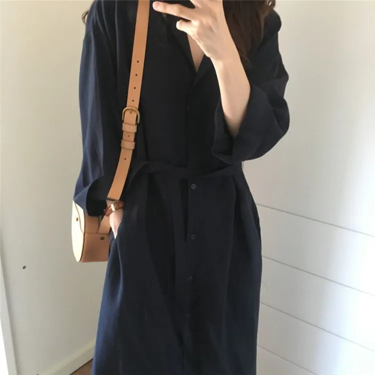 Женское платье-рубашка на пуговицах, синее или коричневое свободное Повседневное платье-кардиган составного кроя с длинными рукавами и отложным воротником