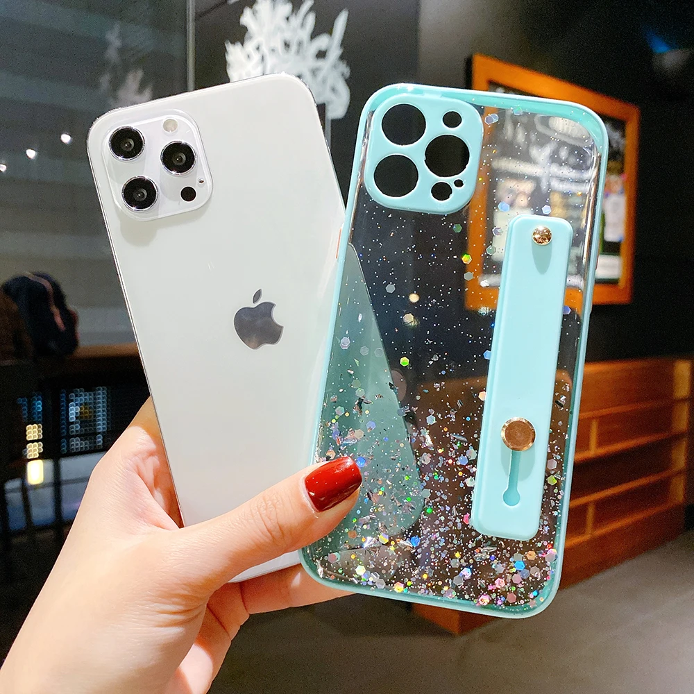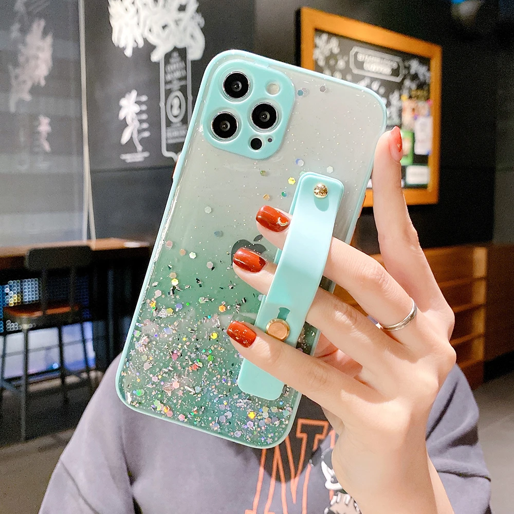 Прозрачный чехол для телефона LOVECOM с градиентом и блестками для iPhone 13 Pro Max 11 12 Pro Max XR XS Max 8 7 Plus X, мягкий чехол-подставка с ремешком на запястье