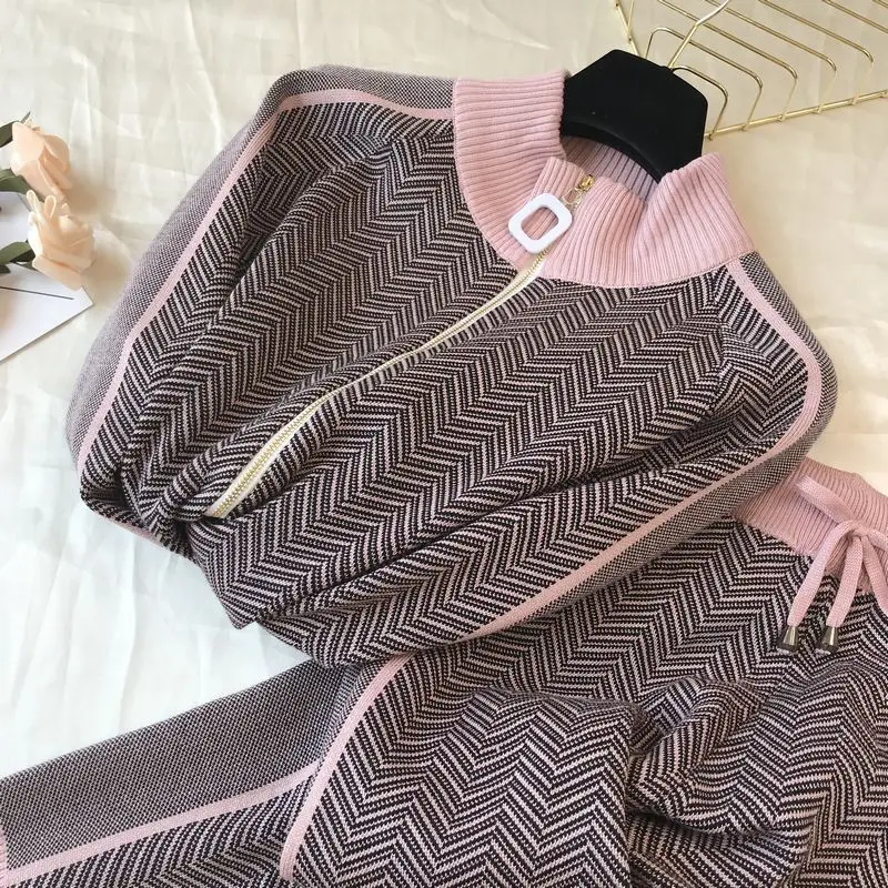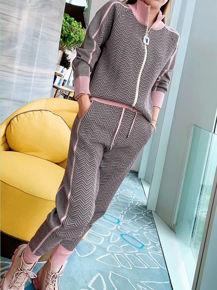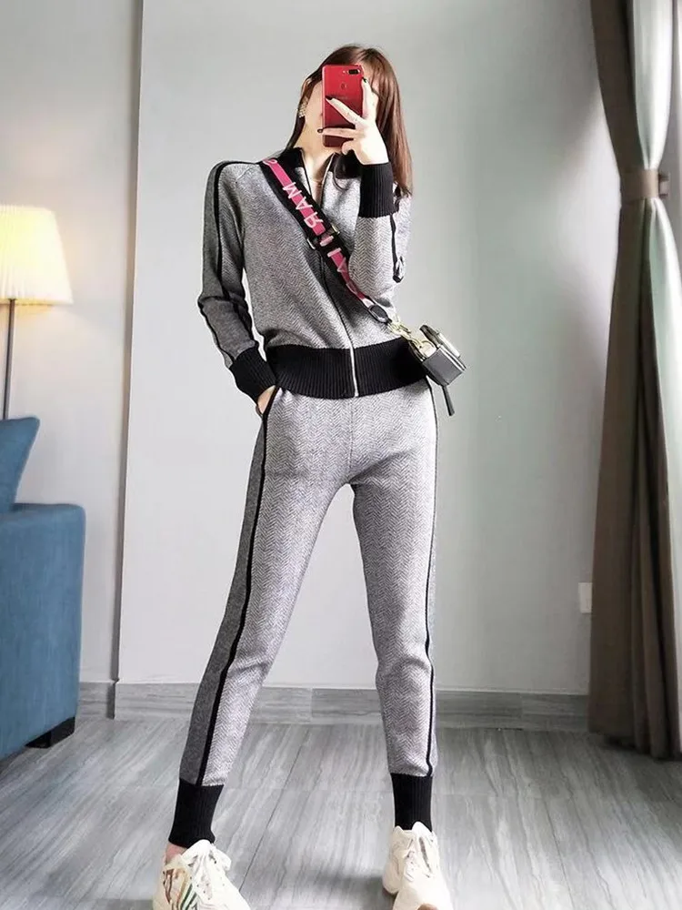 Женский трикотажный костюм, спортивный костюм из двух предметов, свитер, пальто, брюки с эластичной резинкой, на весну, 2021