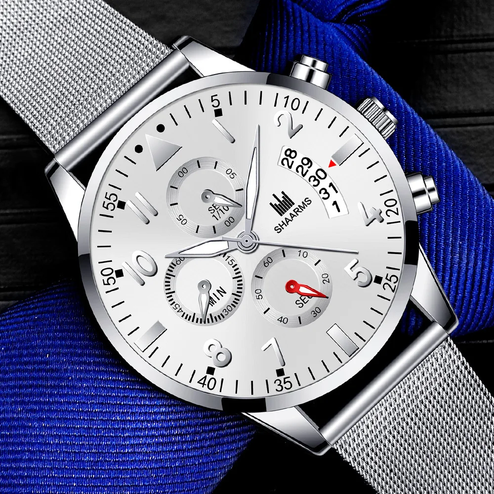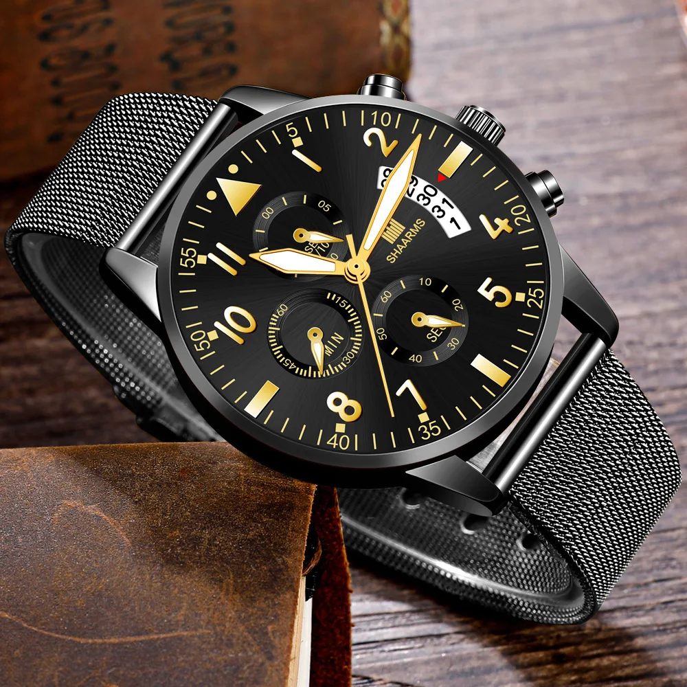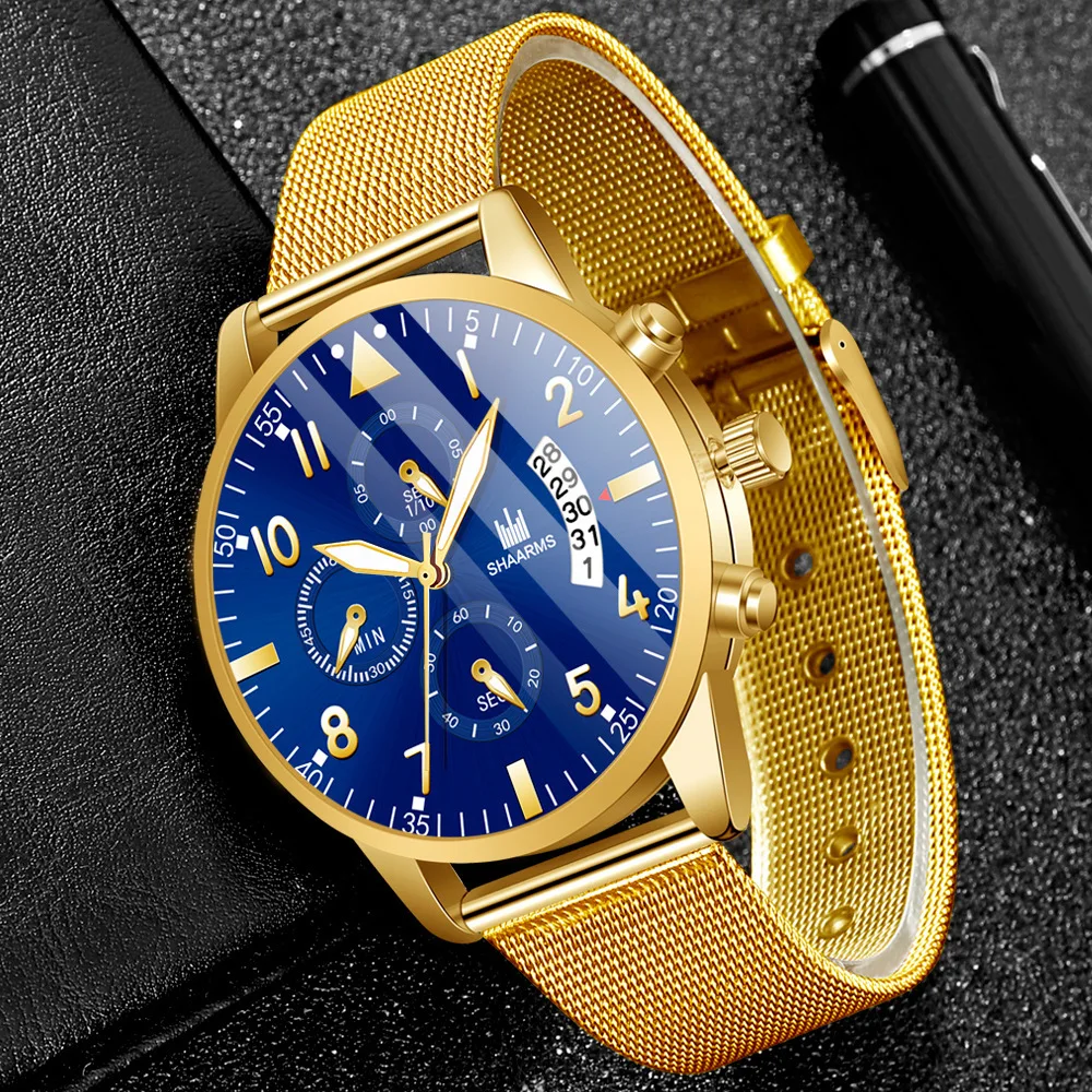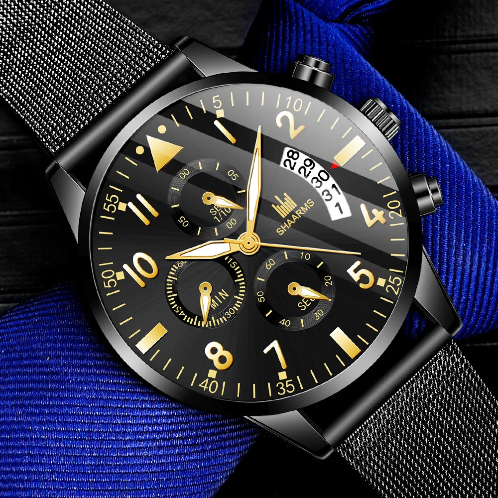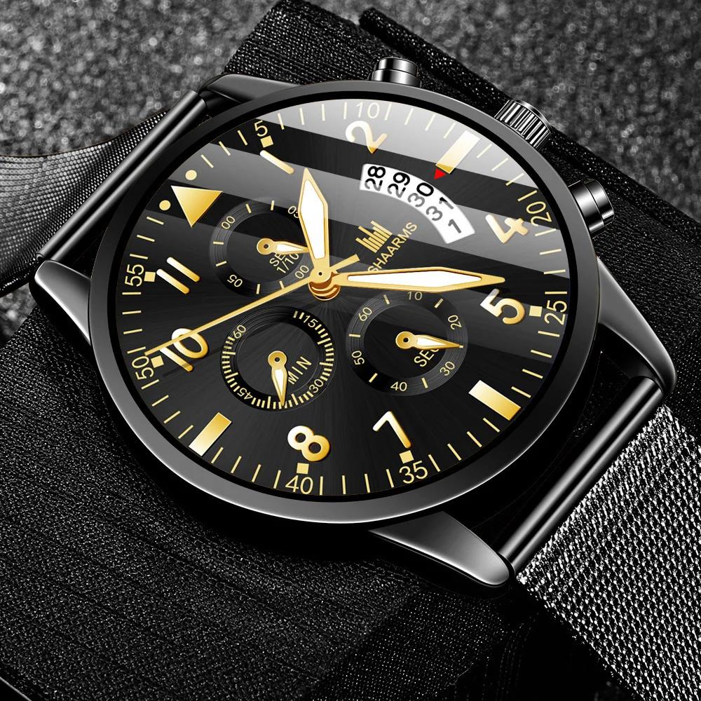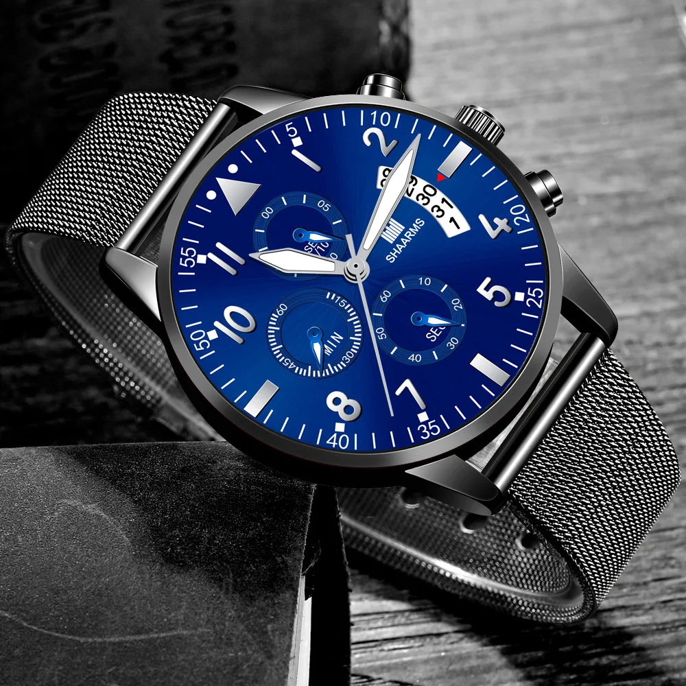 Часы мужские, знаменитый календарь, деловые, из нержавеющей стали, с сетчатым браслетом