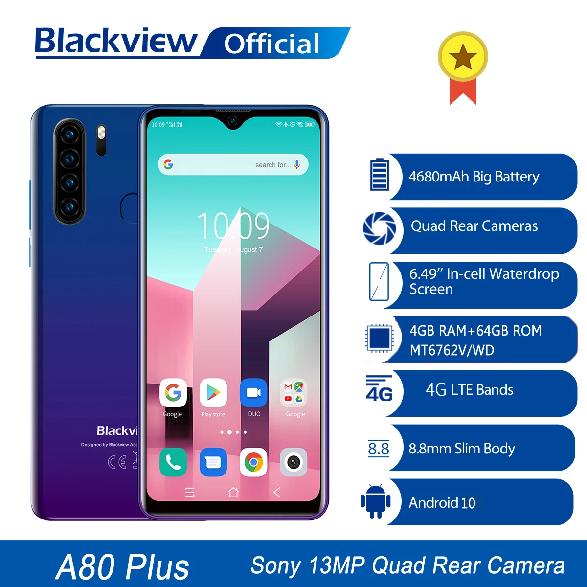 Blackview A80 Plus смартфон, восемь ядер, экран 6,49 дюйма, 4 Гб + 64 ГБ