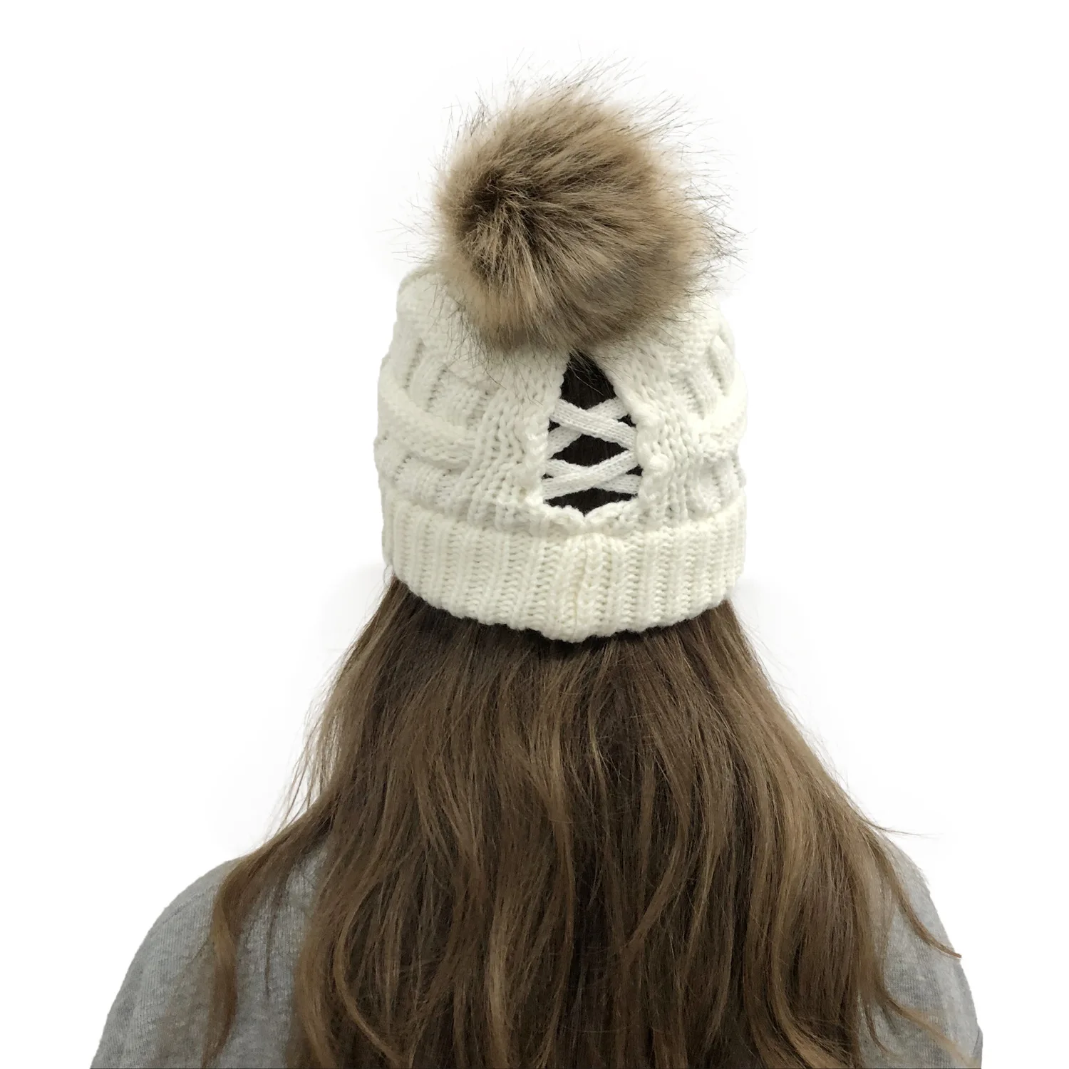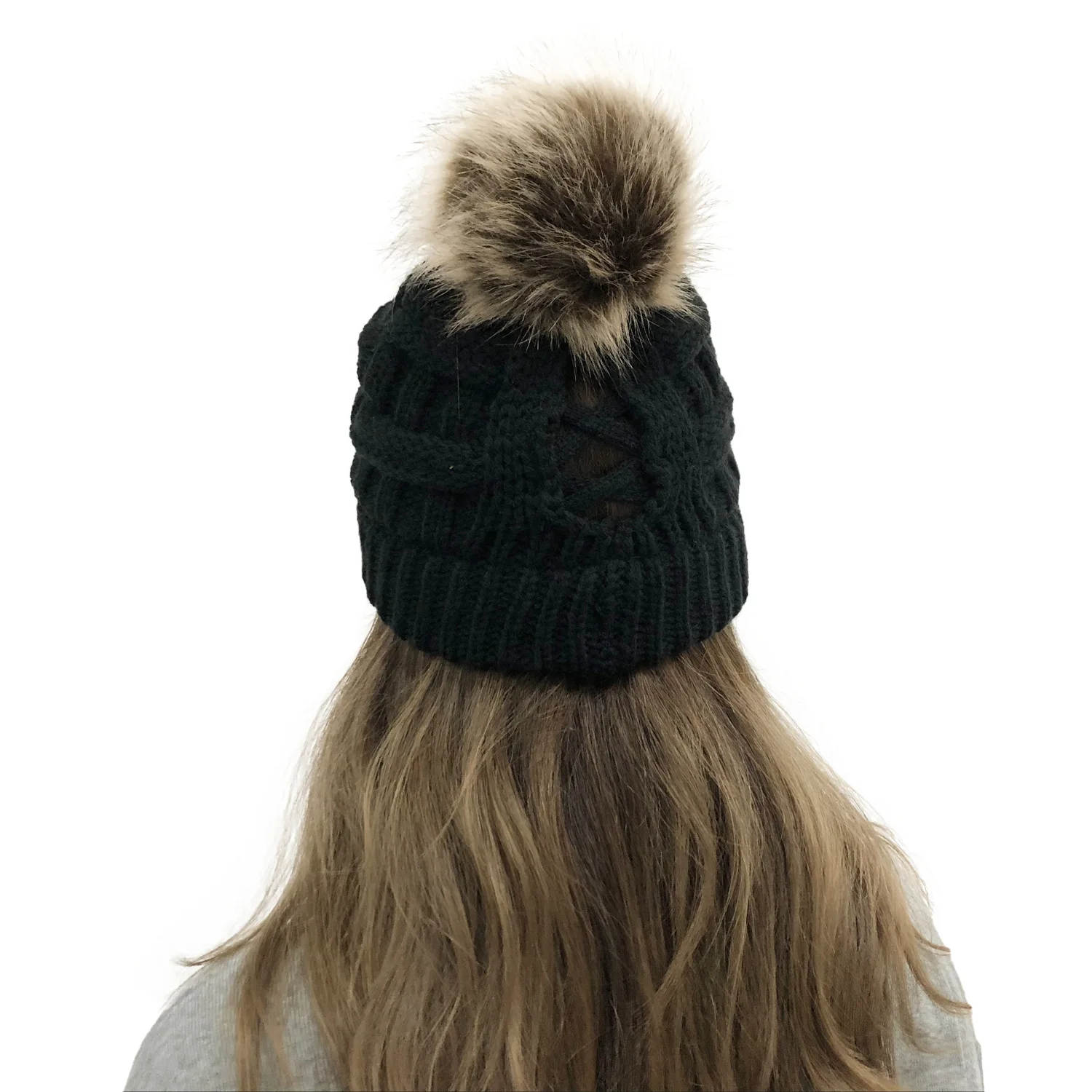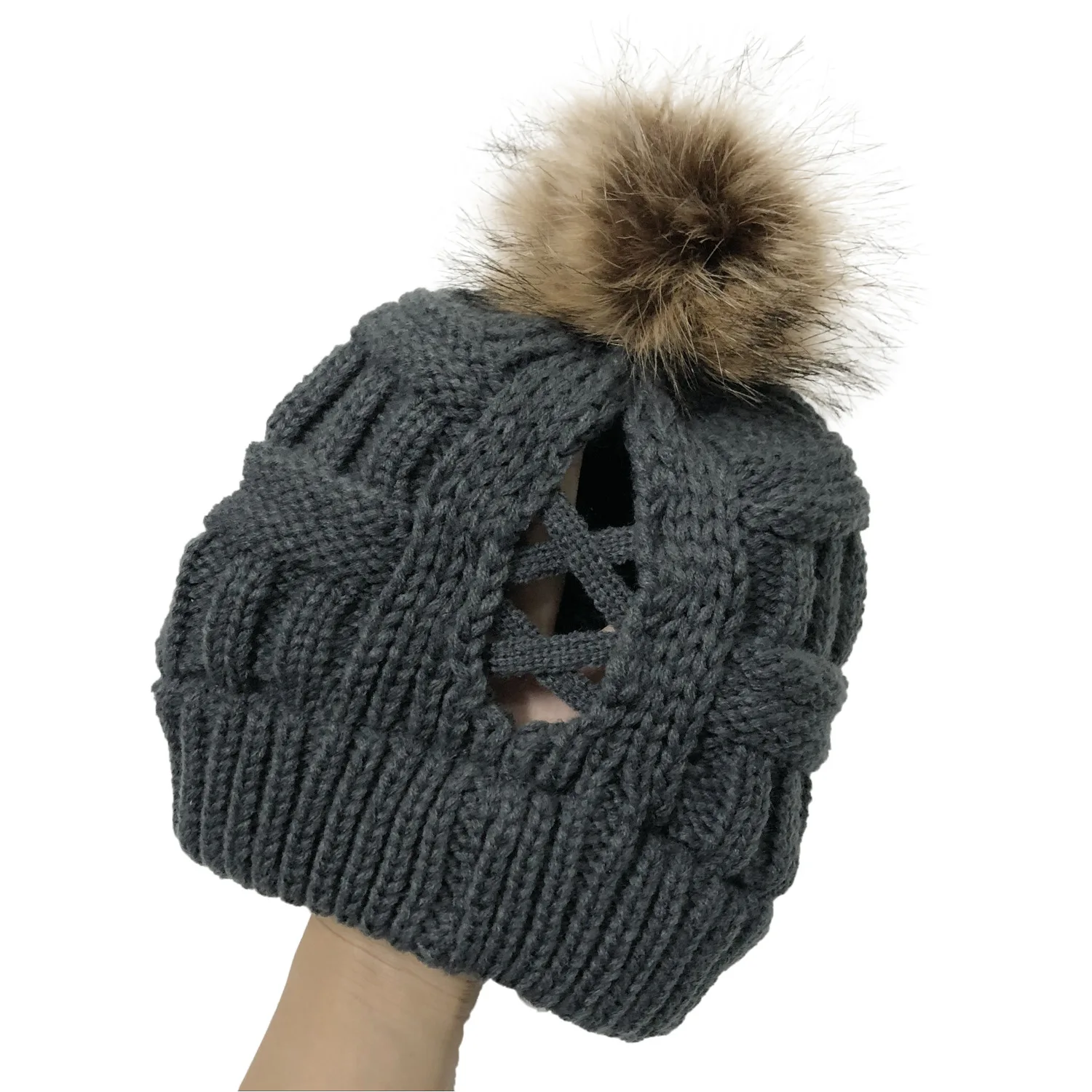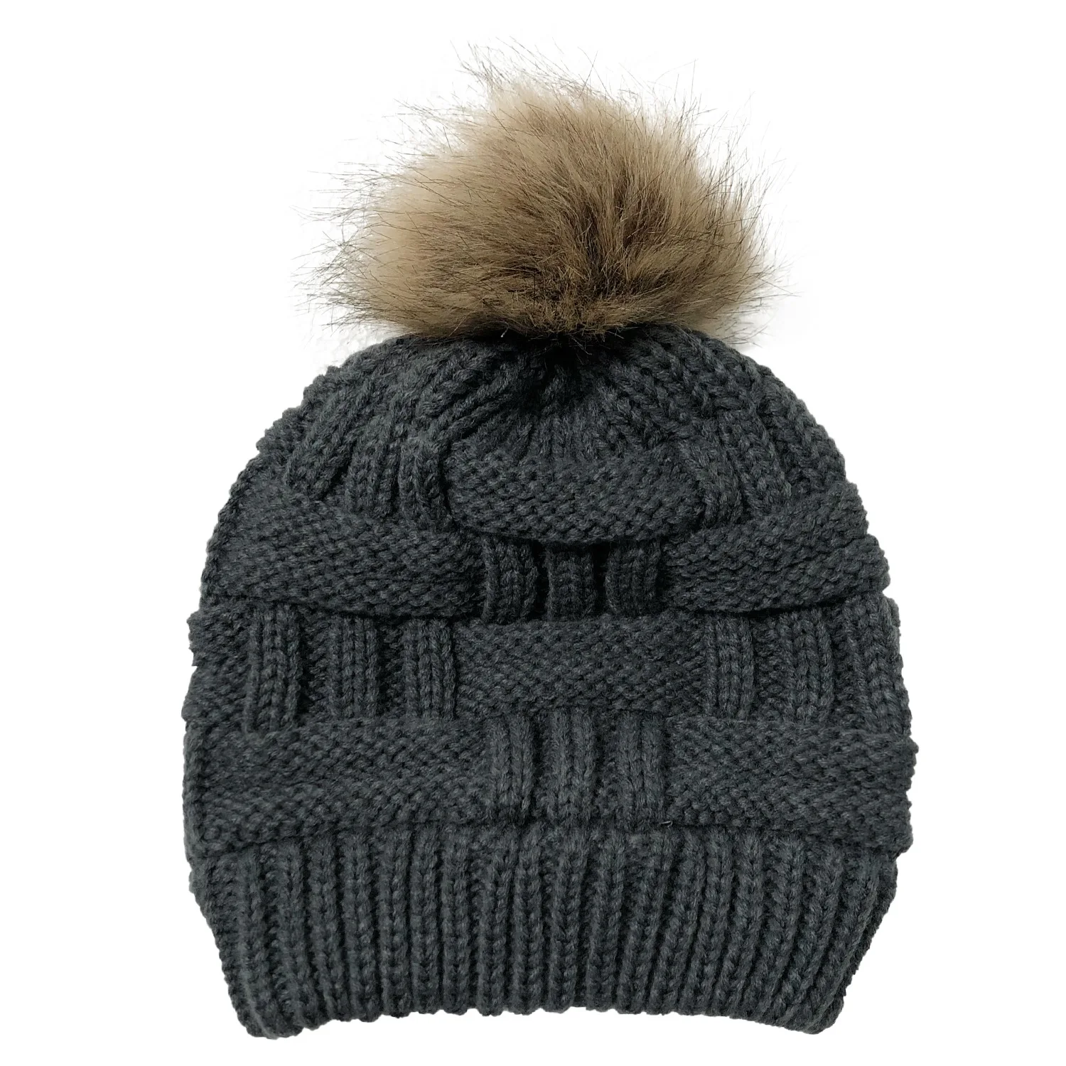 Эксклюзивная мягкая шапка бини с меховым помпоном женская вязаная зимняя шапка стрейчевая шапка для конского хвоста шапка для пучка волос вязаная шапка с напуском теплая шапка