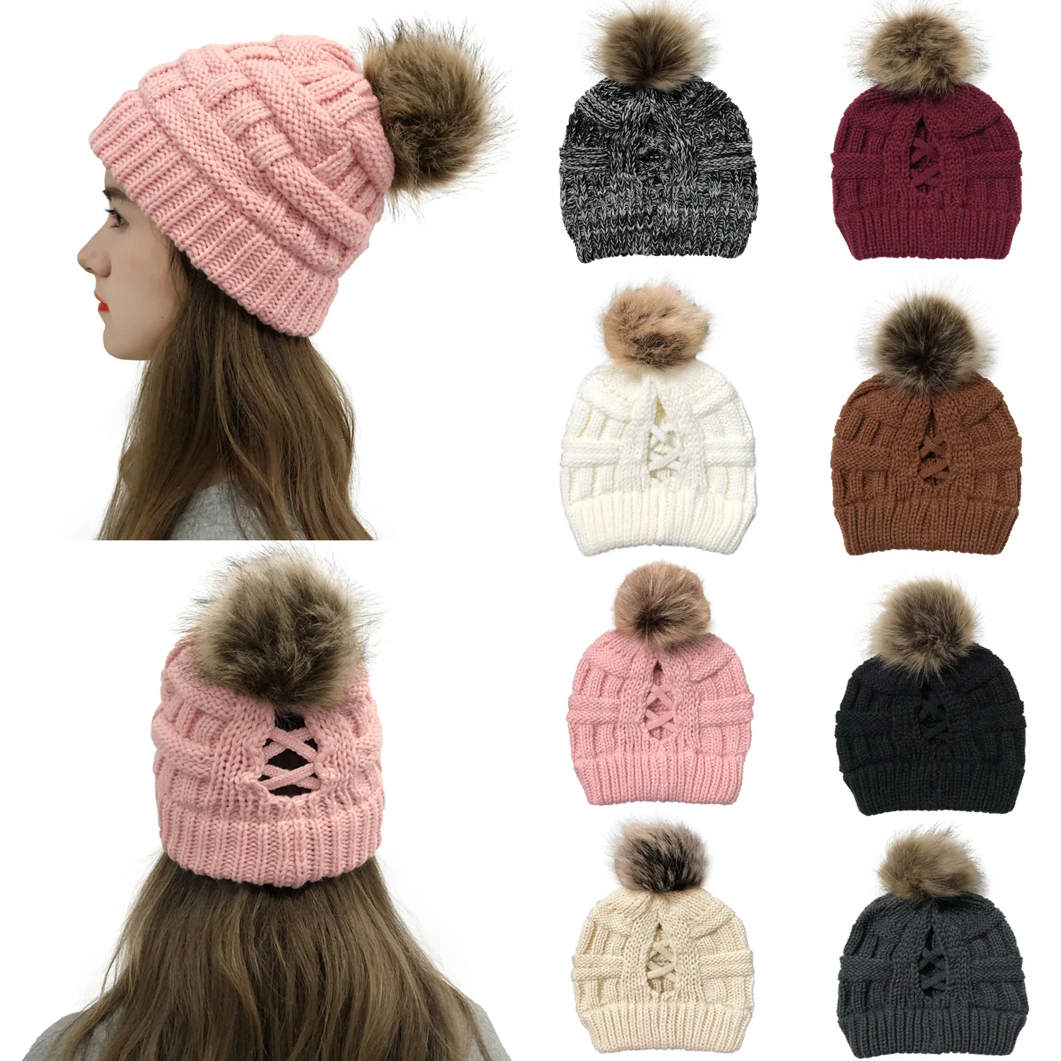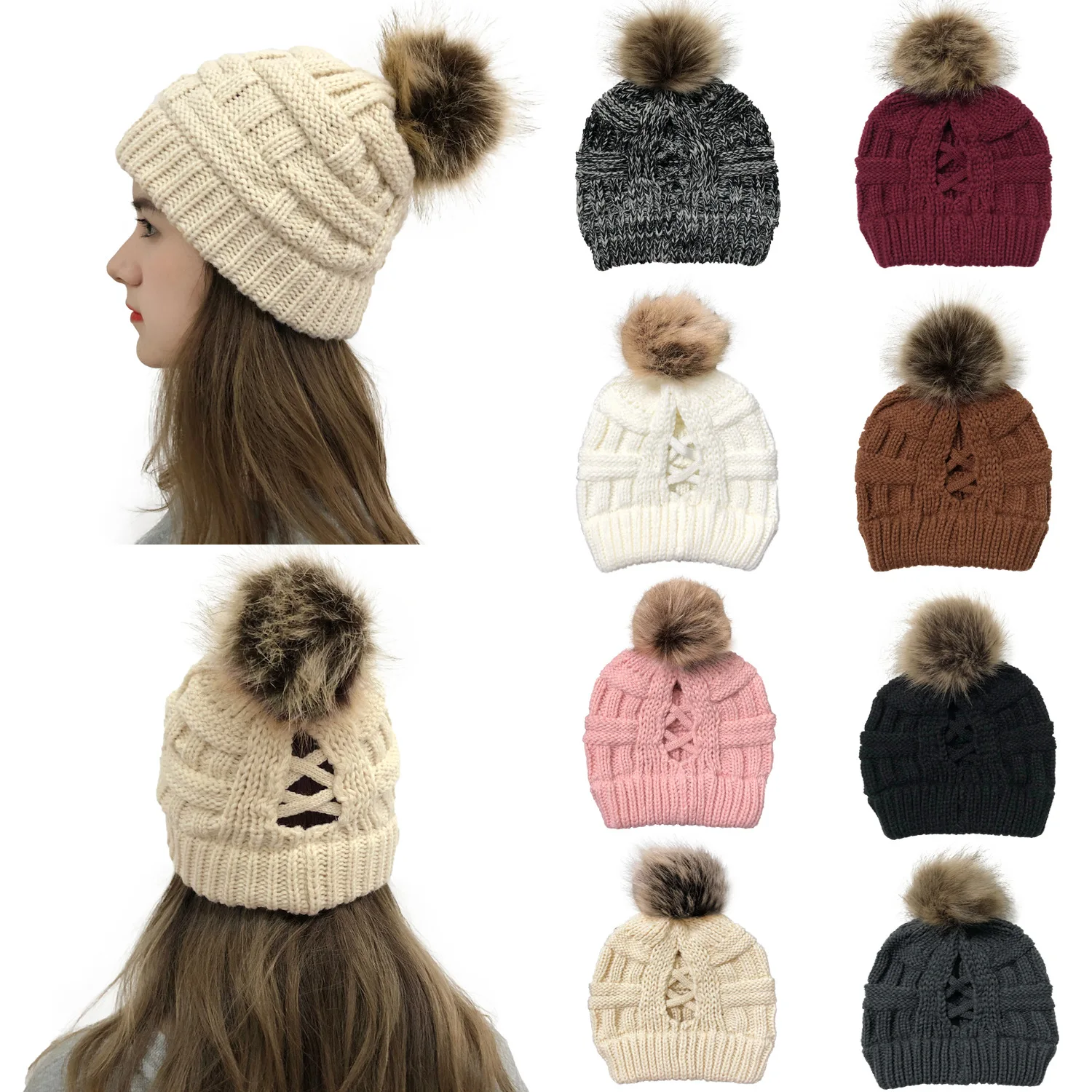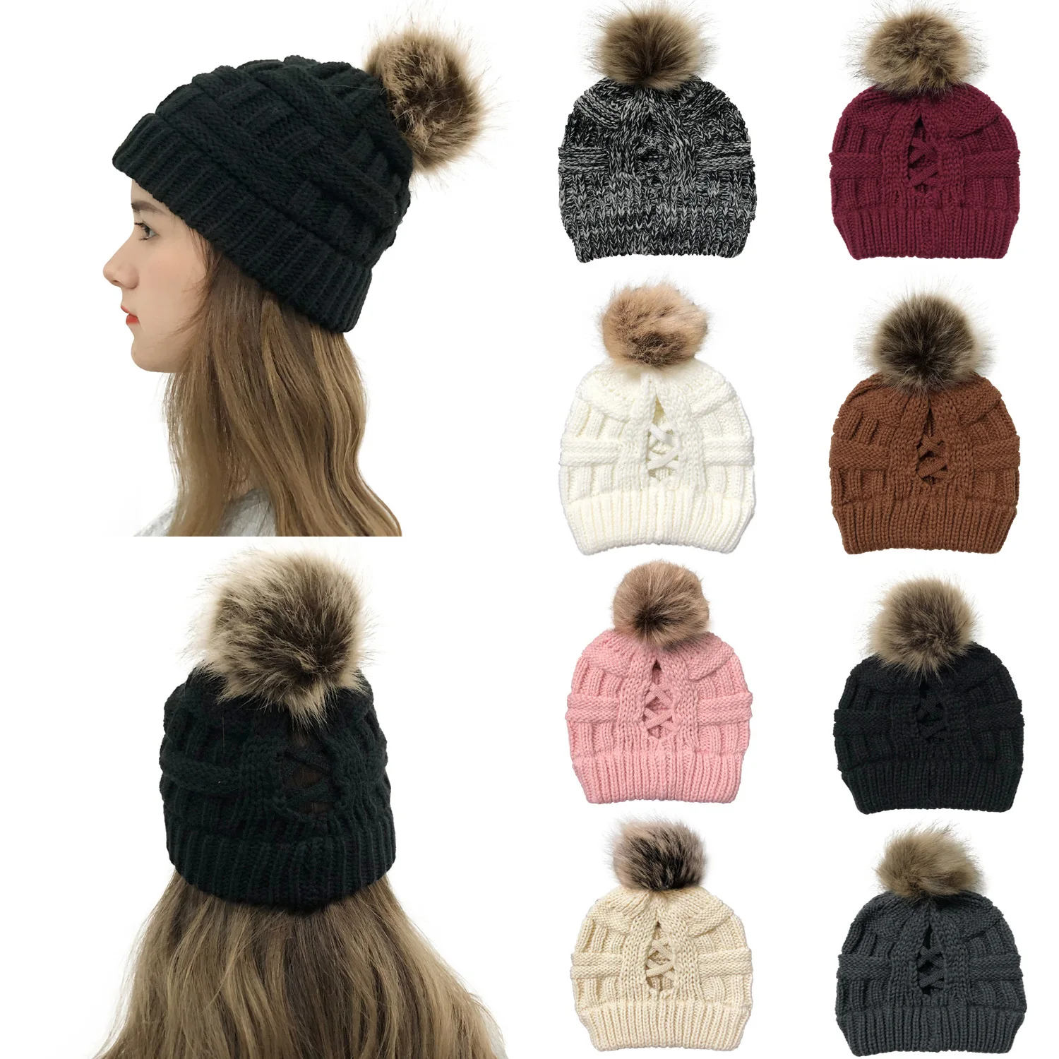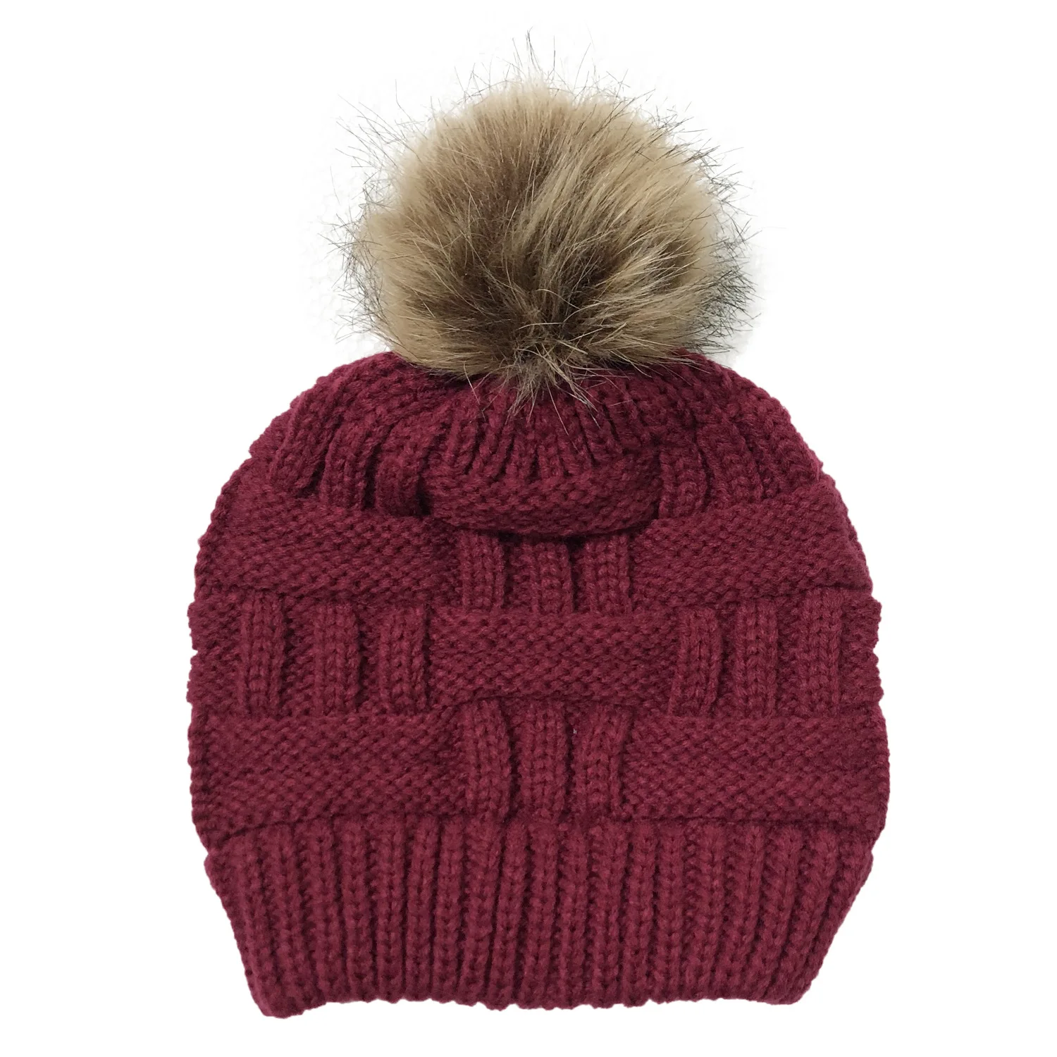 Эксклюзивная мягкая шапка бини с меховым помпоном женская вязаная зимняя шапка стрейчевая шапка для конского хвоста шапка для пучка волос вязаная шапка с напуском теплая шапка