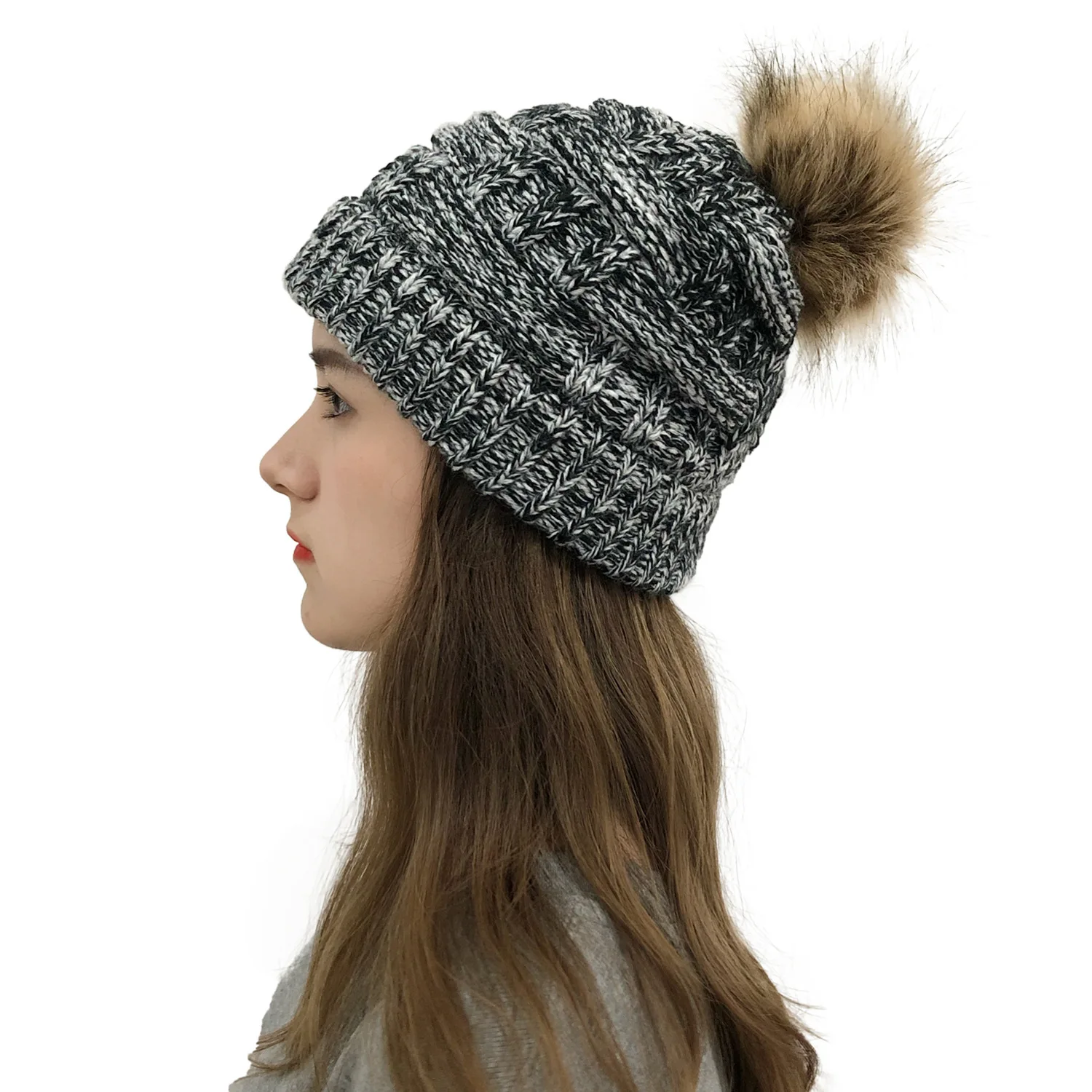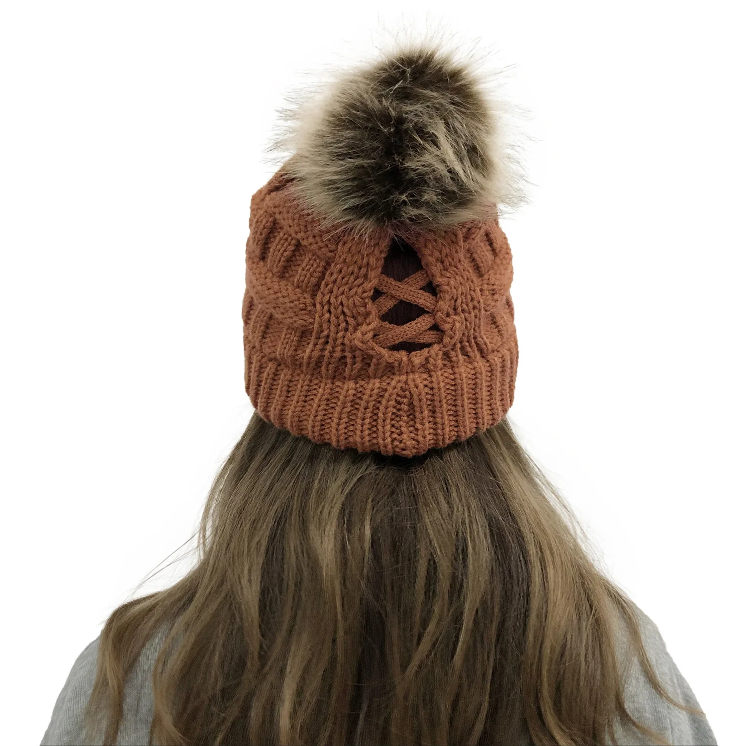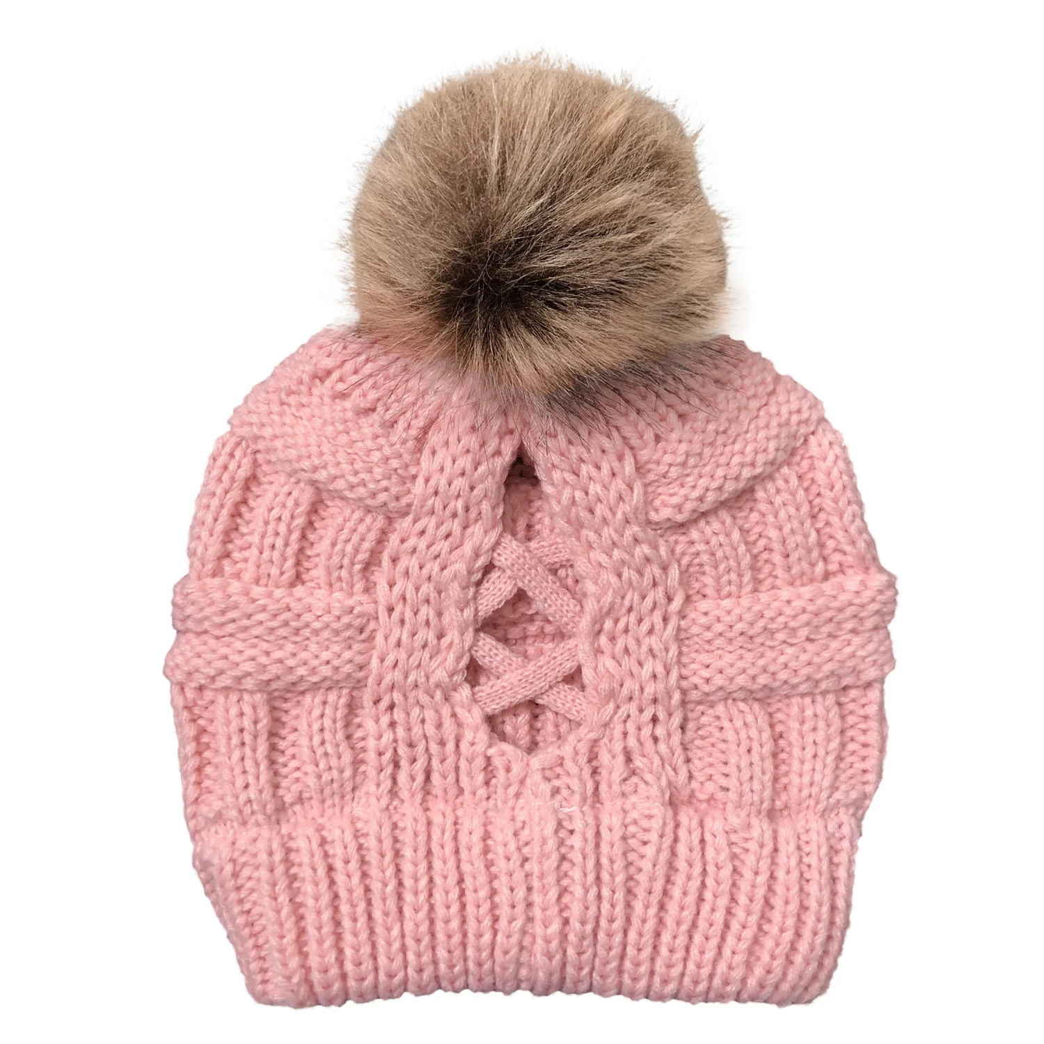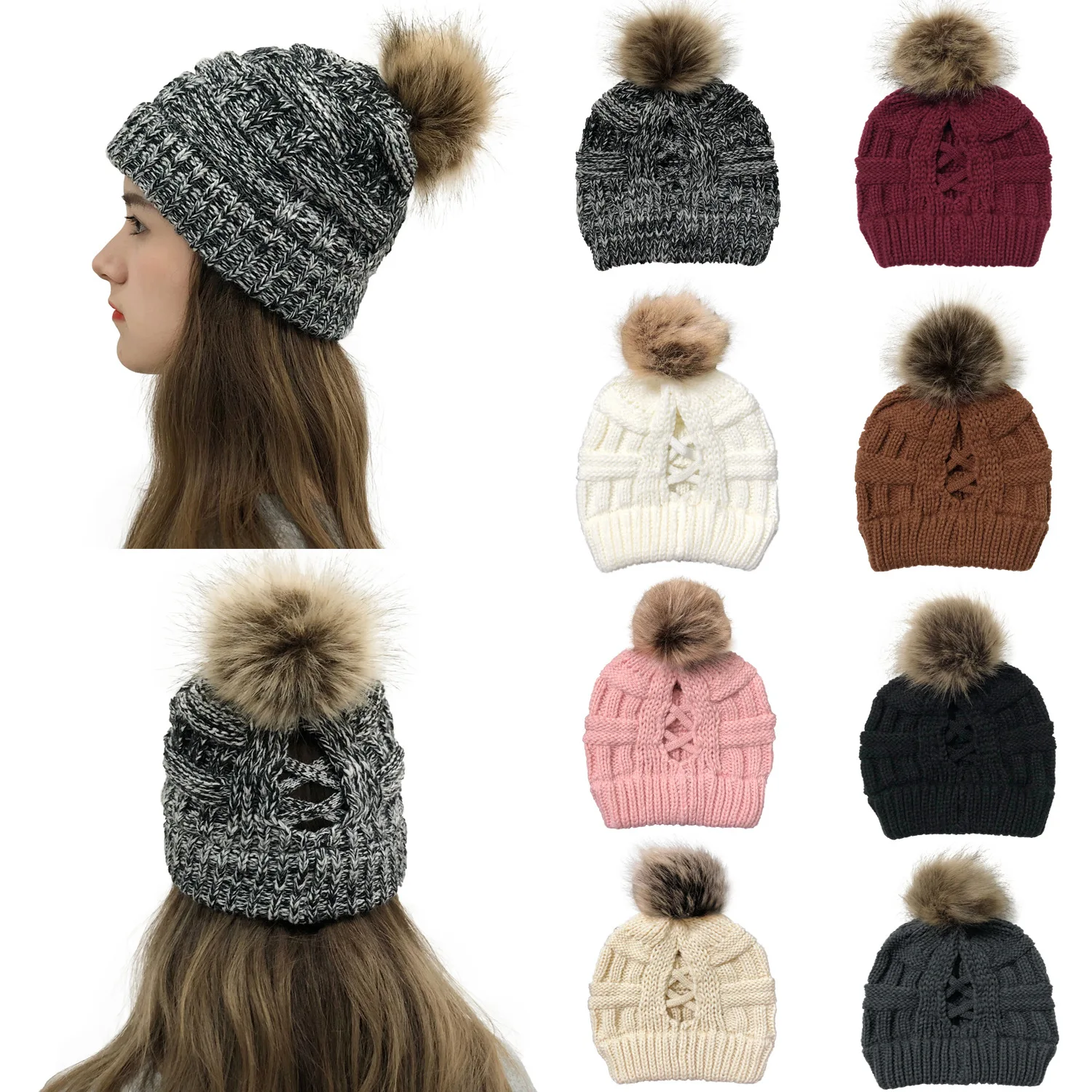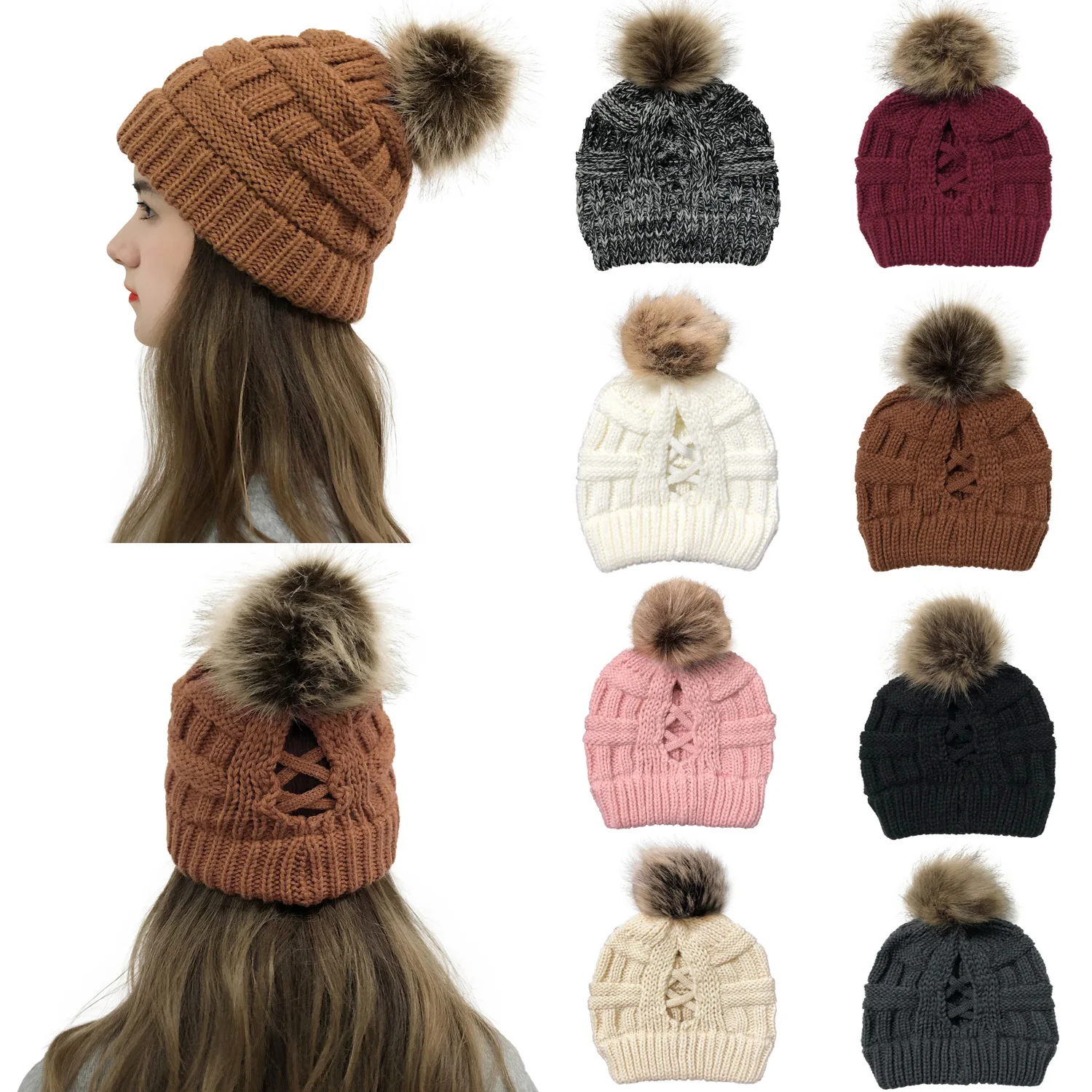 Эксклюзивная мягкая шапка бини с меховым помпоном женская вязаная зимняя шапка стрейчевая шапка для конского хвоста шапка для пучка волос вязаная шапка с напуском теплая шапка
