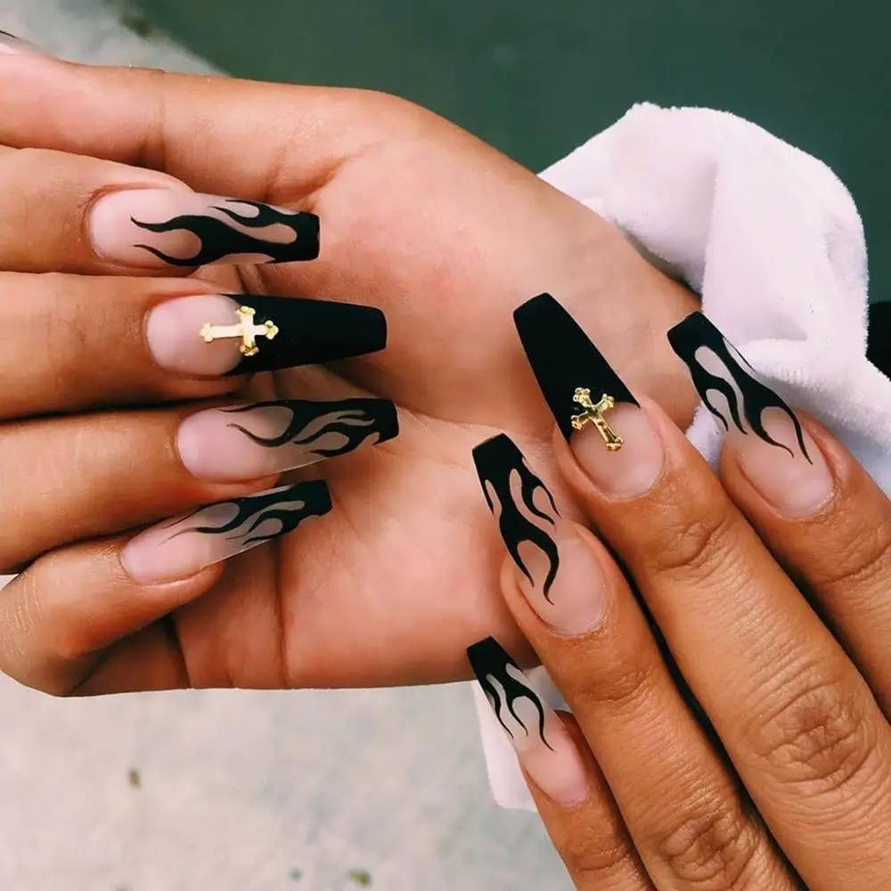 24 шт.коркор. 2021 Модные накладные ногти с черным пламенем, искусс...