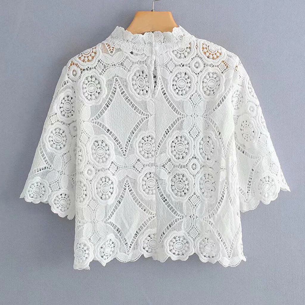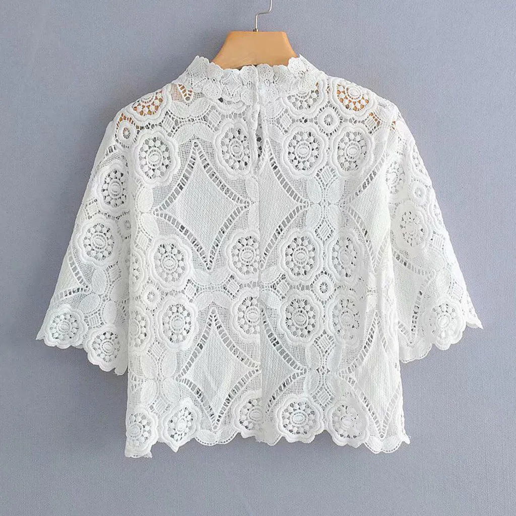 Белая женская блузка с круглым вырезом, винтажные Женские топы с цветочным узором, повседневные кружевные с коротким рукавом, блуза, рубашки, женская одежда #3