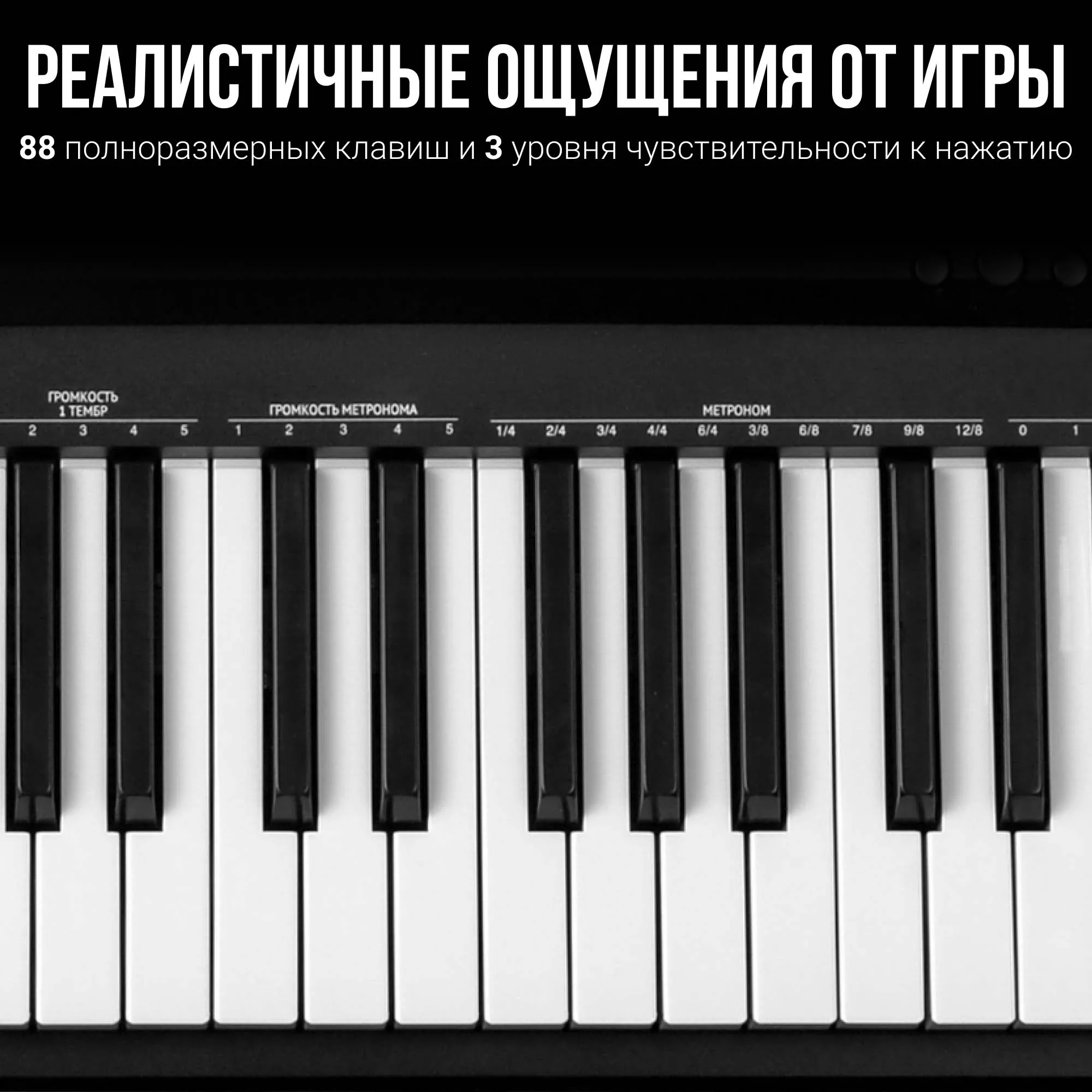 Цифровое профессиональное пианино Tesler KB-8850 поможет раскрыть музыкальный талант и подойдет даже продвинутым пианистам. Полноразмерная клавиатура на 88 клавиш, 3 уровня чувствительности к нажатию, мощная стерео-акустическая система 5Вт х 2 динамика, педаль сустейна (идет в комплекте) и MIDI-выход - все это делает цифровое пианино Tesler KB-8850 отличным вариантом для тех, кто ценит качественный звук и функционал. Предусмотрен mp3 плеер через USB вход, теперь вы можете аккомпанировать существующим произведениям или использовать Tesler KB-8850 как проигрыватель вашей музыки. Возможно обучение с использованием планшета или смартфона (кабель OTG и ПО приобретается отдельно) и использование в качестве MIDI-клавиатуры.