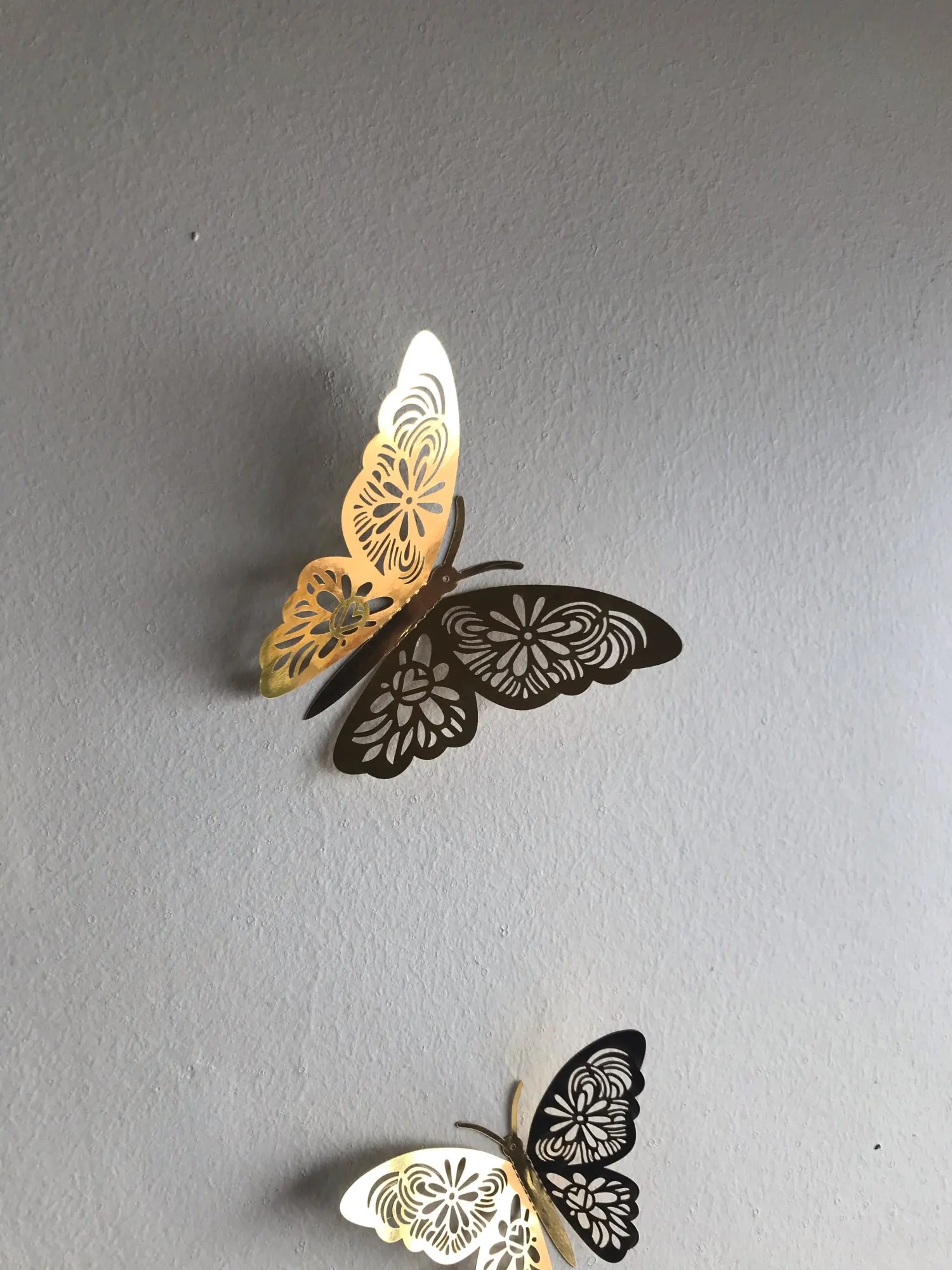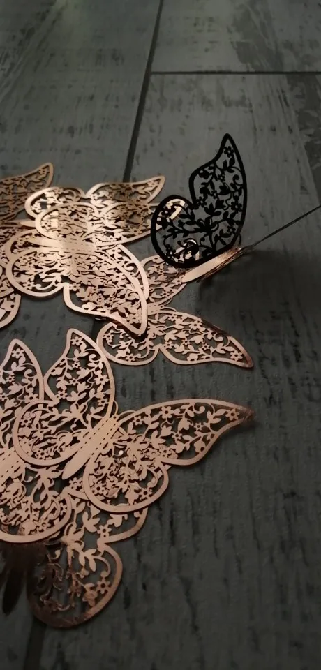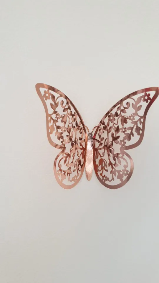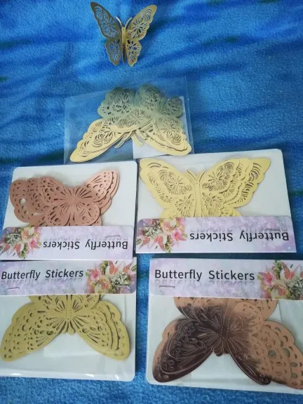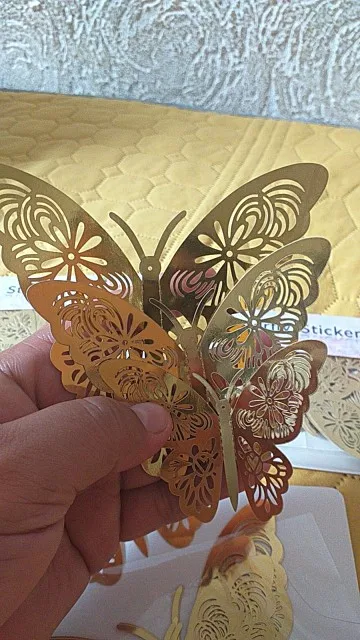 Очень красивые бабочки, заказала 2 цвета , золотые подарила, поэтому фото только одних. Ажурные, будут красиво смотреться и на мебели и на холодильнике, окне, в общем на что фантазии хватит. 12 штук, с липучками двусторонними, всё соответствует. Доставка меньше месяца, спасибо продавцу
