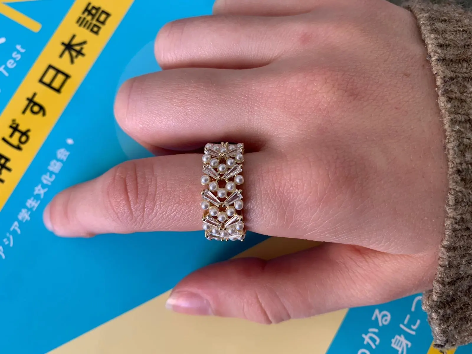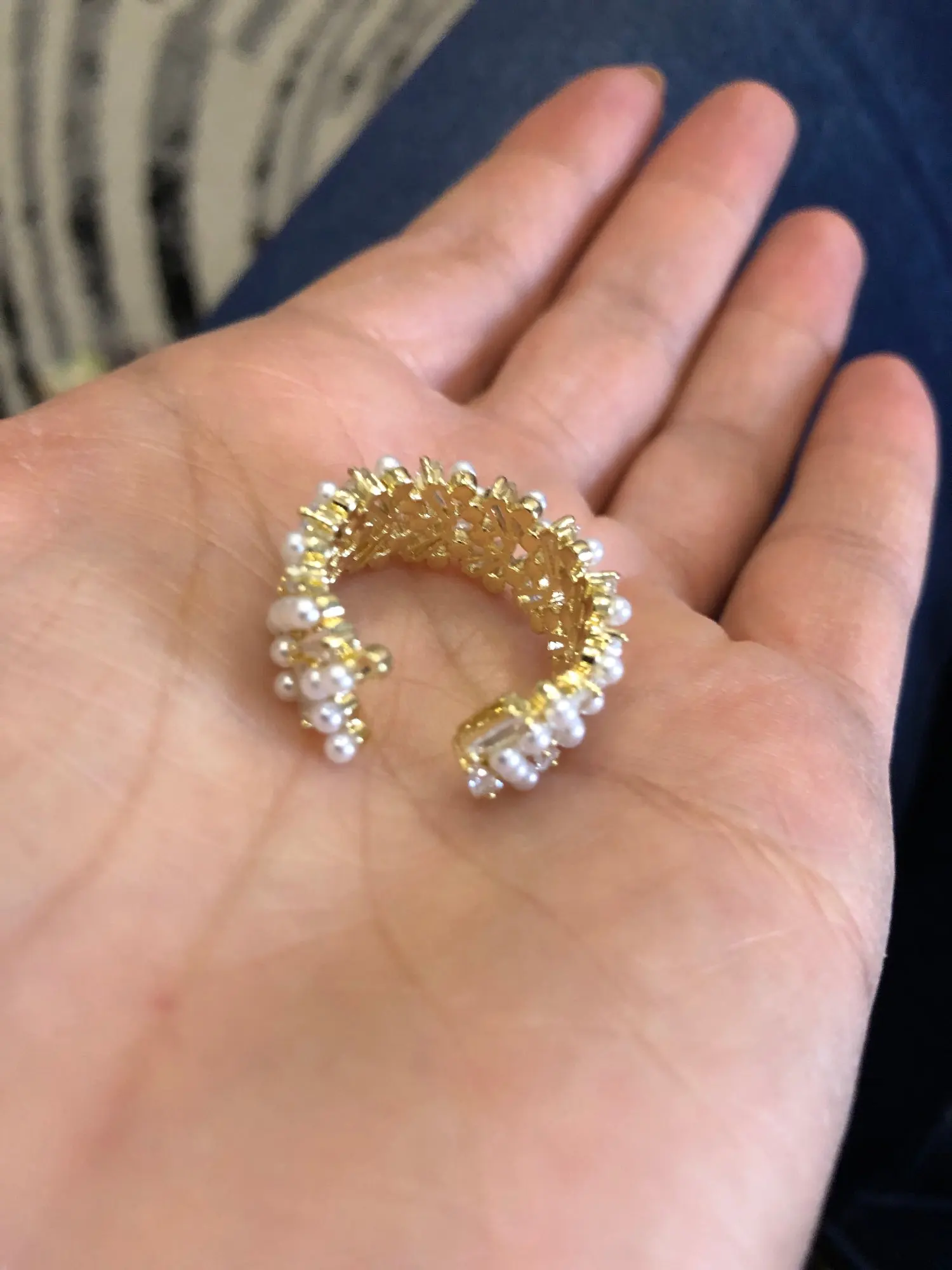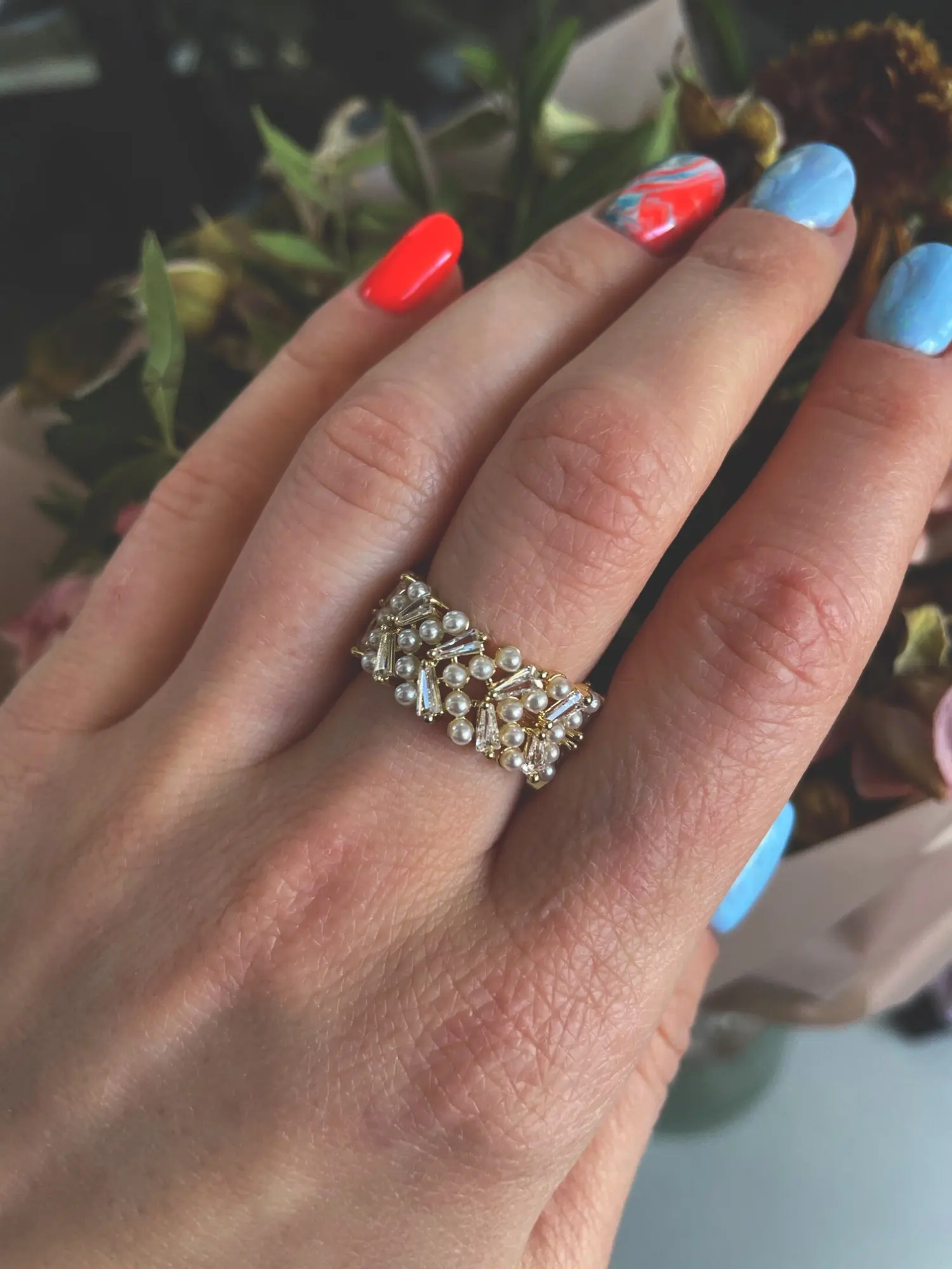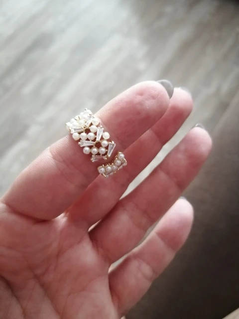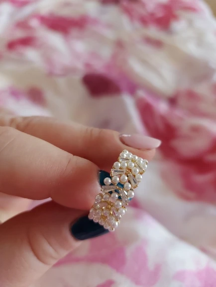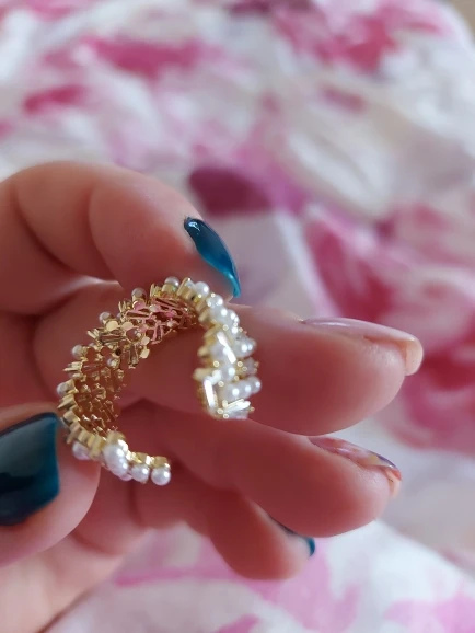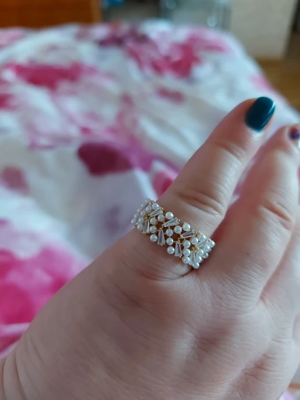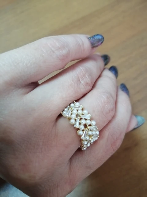 Очень красивое кольцо. Нарядное. Красиво блестит. Все камушки и жемчужинки на месте. Надо немного привыкнуть к тому, что оно на пальце. Выглядит так же, как и на фото. Рекомендую товар и продавца. Огромное спасибо!!!