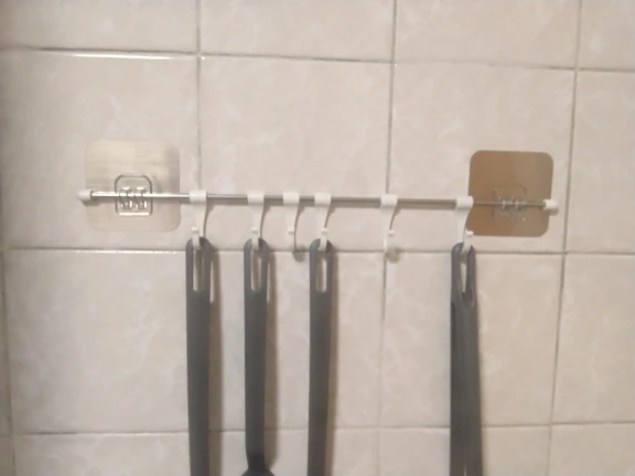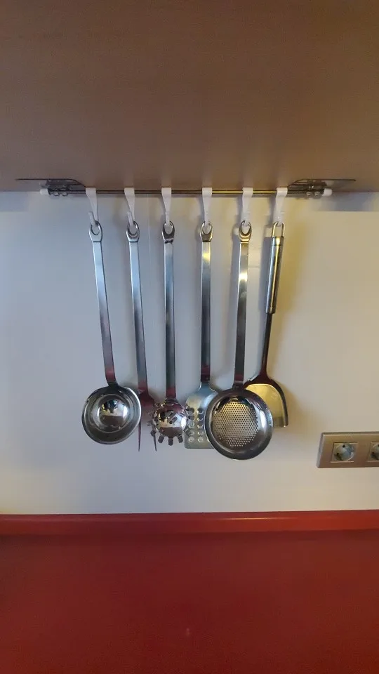 Хорошо клеится к шкафчику и держит кухонные приборы