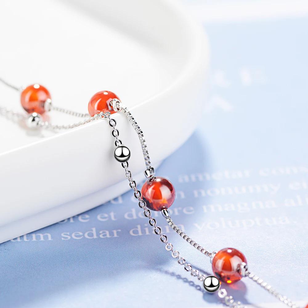 Браслет из стерлингового серебра 925 пробы с красным гранатовым камнем, двухслойная цепочка с бусинами, связанная для женщин, изящный браслет, Подарочная бижутерия