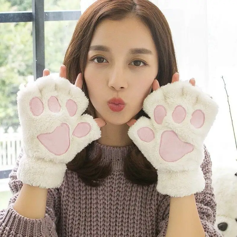 Женские зимние перчатки кошачьей лапы в Корейском стиле, милые толстые теплые плюшевые перчатки на полпальца без пальцев для девушек