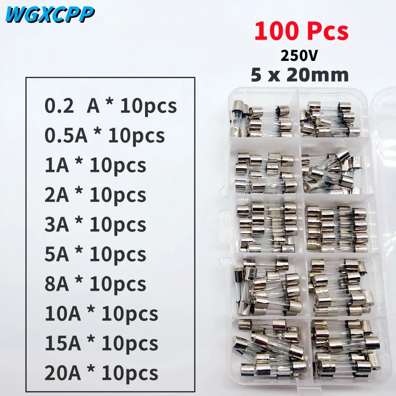 100 шт., комплект предохранителей из быстрого выдувного стекла, 5x20 250 В, для защиты от тока цепи, 5*20 мм, 0,20,5123456781015202530A