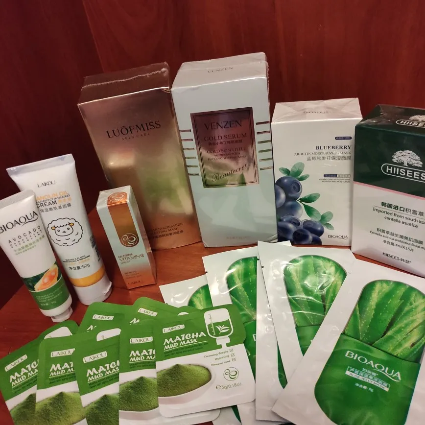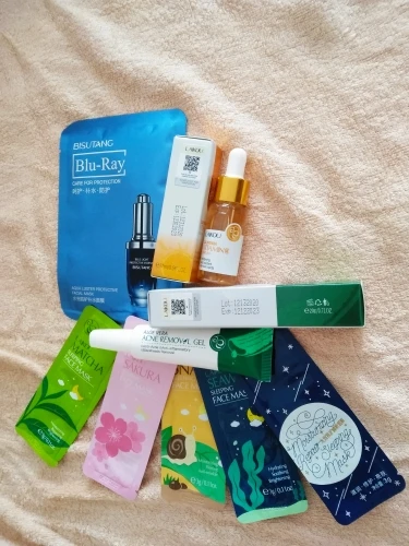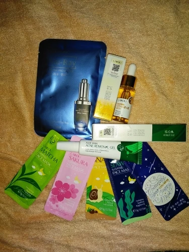 всё получила в целости и сохранности, упаковки не помялись. Сыворотка с витамином С (упаковка золотистая с белым): жидкая как вода, немного маслянистая консистенция, впитывается быстро, увлажняет. На упаковке есть штрих коды, с защитой. Гель с алоэ (упаковка белая с зелёным): немного густой, немного щипит и полностью не впитывается, остаётся липкость, поэтому гель нельзя использовать перед выходом из дома. Одну маску попробовала, ее нет на фото: хорошо увлажняет, кожа становится гладкой. Крем с улиткой тоже увлажняет. Запах у всех средств для лица несильный, нежный, слегка слышен...В целом мне всё понравилось, продавца рекомендую, насчёт результата пока не могу ничего сказать, только начала использовать...