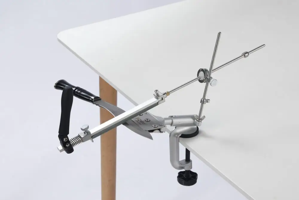 Ручная поворотная точилка для ножей весьма удобна в использовании, она крепится на столешнице любой толщины, а в разобранном виде занимает совсем мало места. Менять и закреплять камни можно достаточно быстро и просто. Точильный станок позволяет затачивать лезвия как прямого, так и серрейторного типа и самостоятельно менять угол заточки.