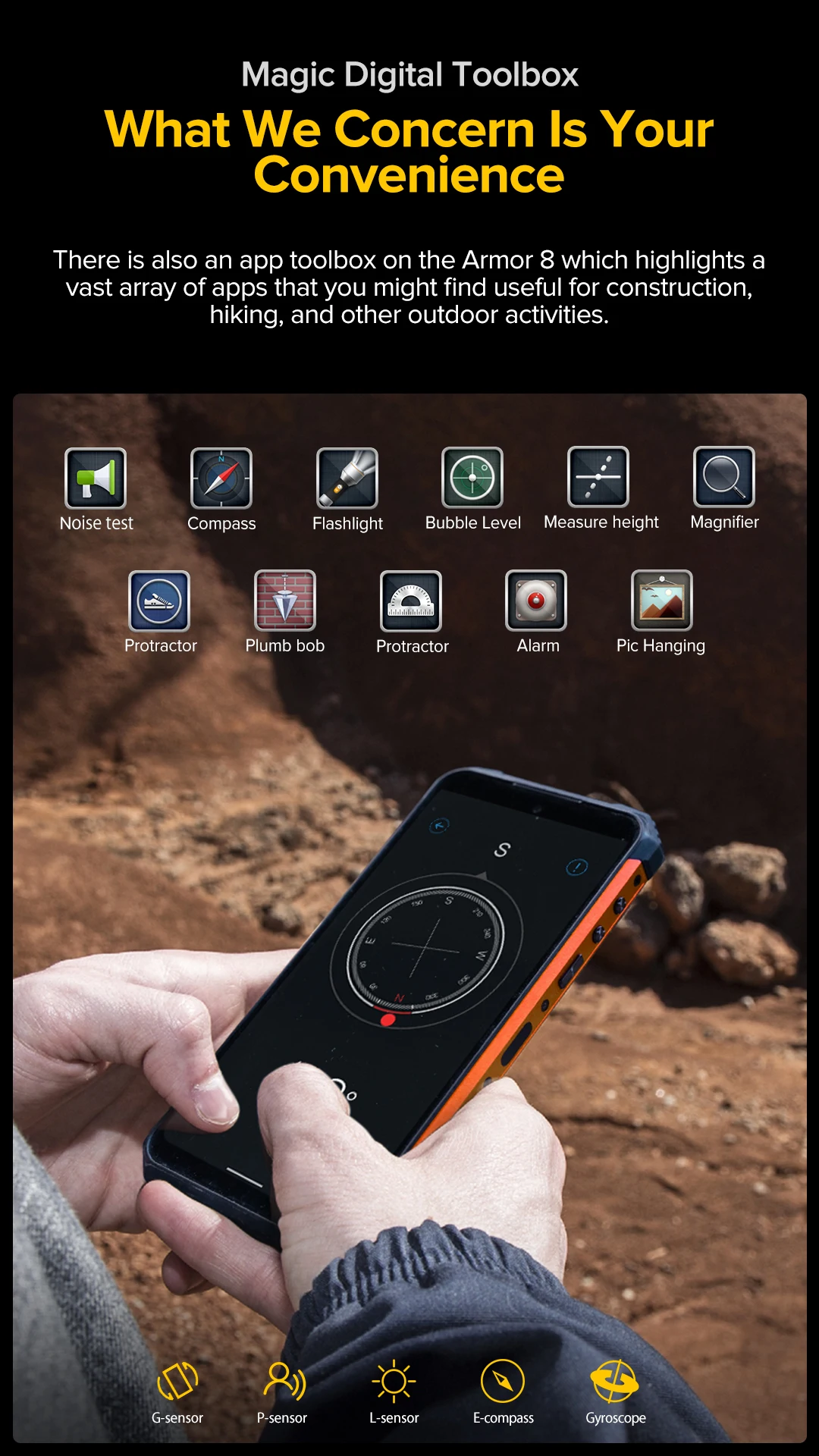 Мы заботимся о вашем удобстве. Также есть приложение toolbox на Armor 8, которое выделяет широкий спектр приложений, которые могут быть использованы для строительства, пеших прогулок и других видов активного отдыха.