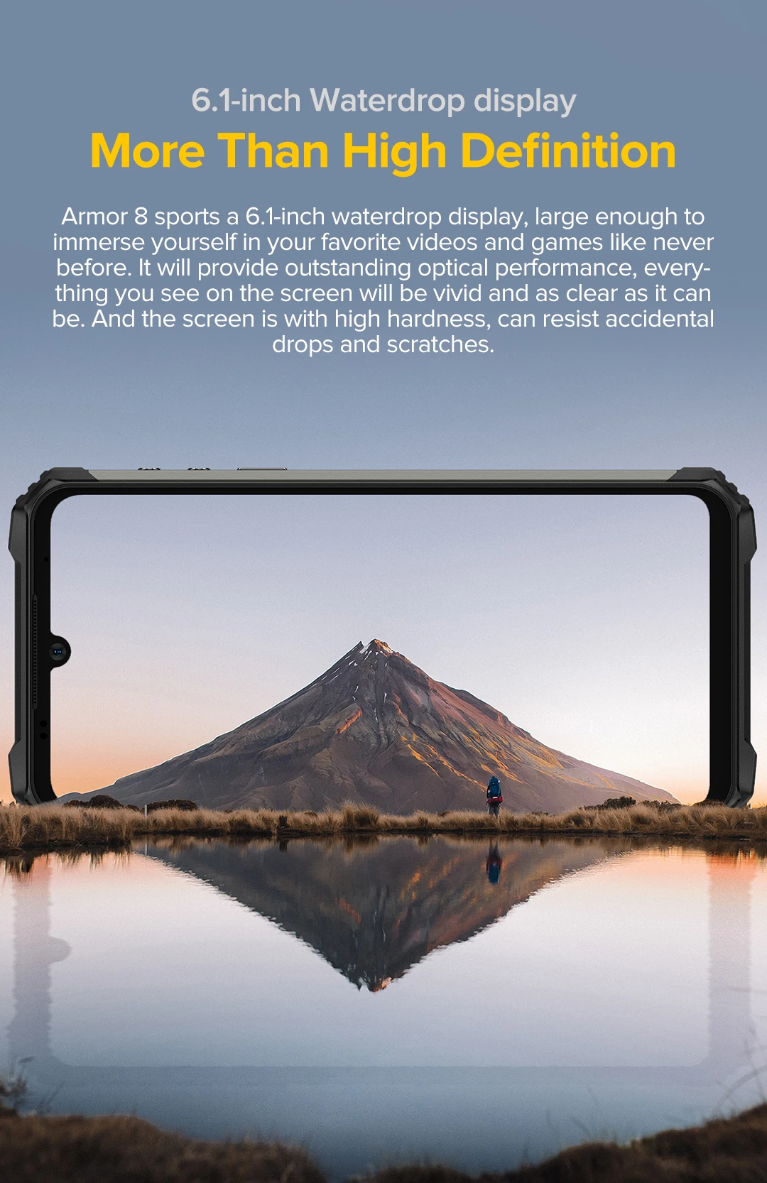 Более высокая DefinitionArmor 8 видов спорта, 6,1-дюймовый в виде капли воды, дисплей, достаточно большой, чтобы полностью погрузиться в ваши любимые видео и игры, как никогда раньше. Он обеспечит выдающиеся оптические характеристики, все, что вы видите на экране, будет ярким и четким, насколько это может быть. И экран с высокой твердостью, может сопротивляться случайным падениям и царапинам.