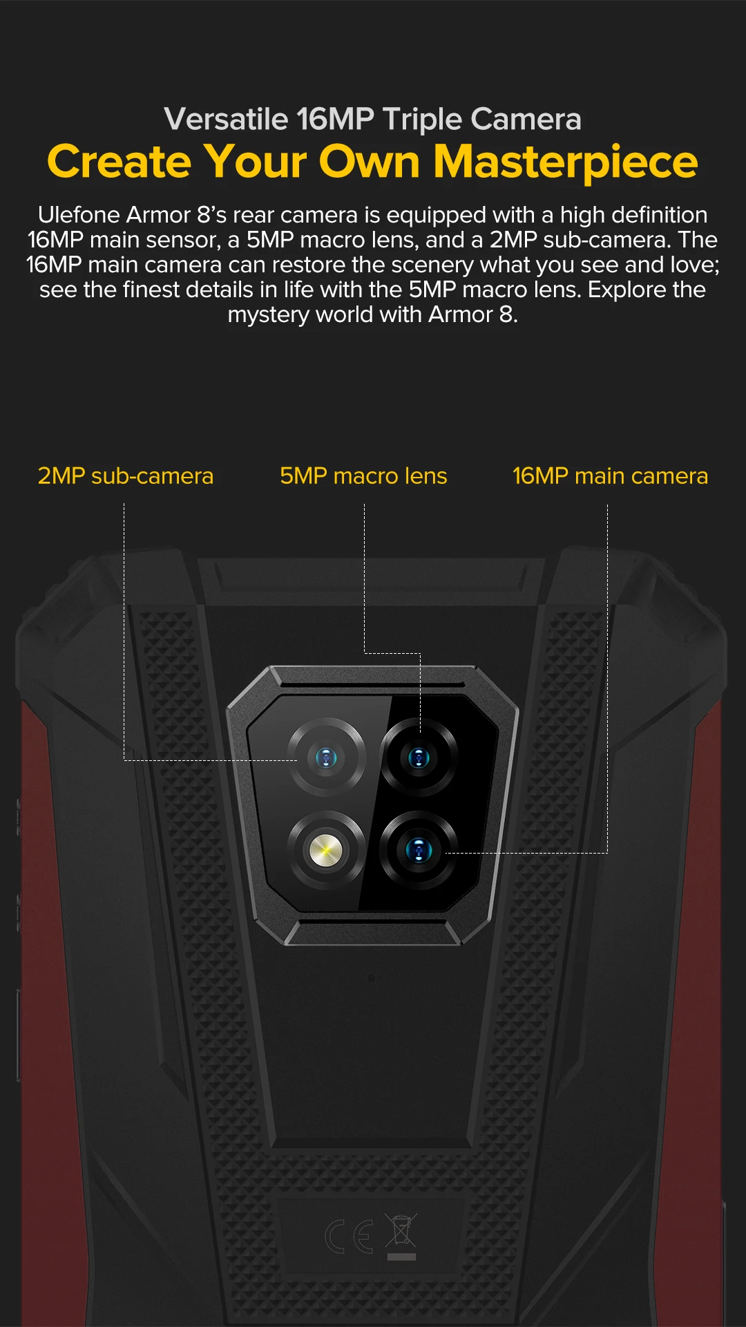 Создайте свою собственную тыловую камеру MasterpieceUlefone Armor 8, оснащенную главным датчиком высокой четкости 16 Мп, макрообъективом 5 Мп и подкамерой 2 МП. Основная камера 16 МП может восстановить пейзаж, который вы видите и любите; Увидеть лучшие детали в жизни с макрообъективом 5 Мп. Исследуйте загадочный мир с броней 8.
