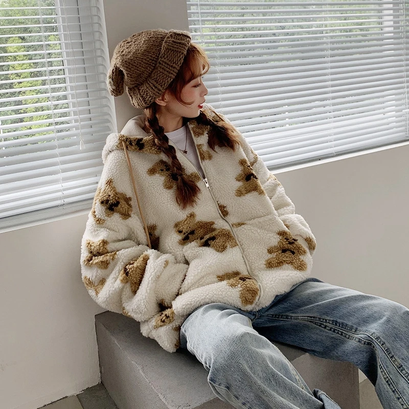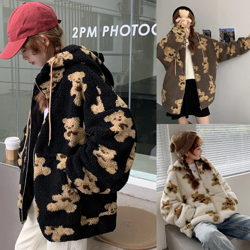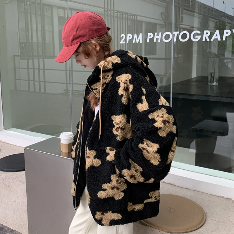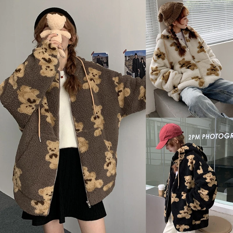 Длинные рукава, эластичные манжеты, объемный мешковатый свободный крой, стиль Харадзюку, принт с милым мультяшным медвежонком.