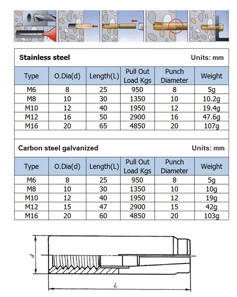 1. Используйте обычную ударную дрель для определения глубины и диаметра сверления в соответствии со спецификациями и моделями анкерных болтов.2. Ручной насос или пневматический насос используется для очистки отверстий.3. Вставьте анкерный болт в отверстие с помощью ударного инструмента, пока все анкерные болты не войдут в отверстие (в направлении открытия)4. Вставьте винт в отверстие через фиксацию и затяните винт с помощью гаечного ключа для установки крутящего момента для завершения установки.