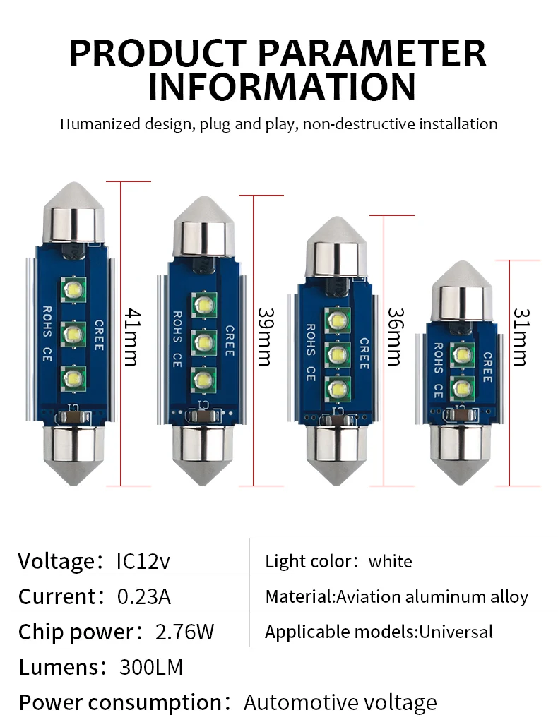 Наименование товара: мм CREE * 2/* 3SMDЭлектрический ток: 0,23 AМощность: 2,76 WГнездо: 31 мм/36 мм/39 мм/41 мм Festoon C5W C10WЦвет: чистый белыйЦветовая температура: 6000k