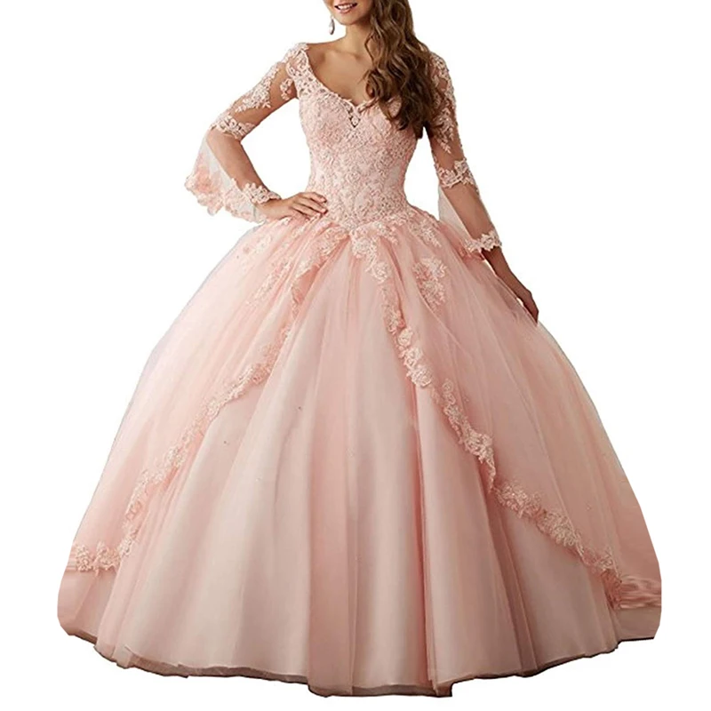 Платье vestido de fiesta с глубоким v-образным вырезом на шее для девочек сладкий 16 Бальные платья с длинными рукавами; Розовые; Праздничное платье принцессы для выпускного вечера бальное платье, свадебное платье