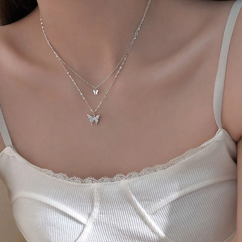 Двухслойное ожерелье серебряного цвета с бабочкой и мигающими брилл...