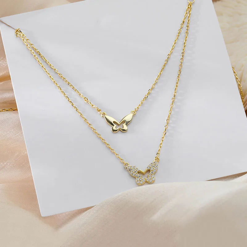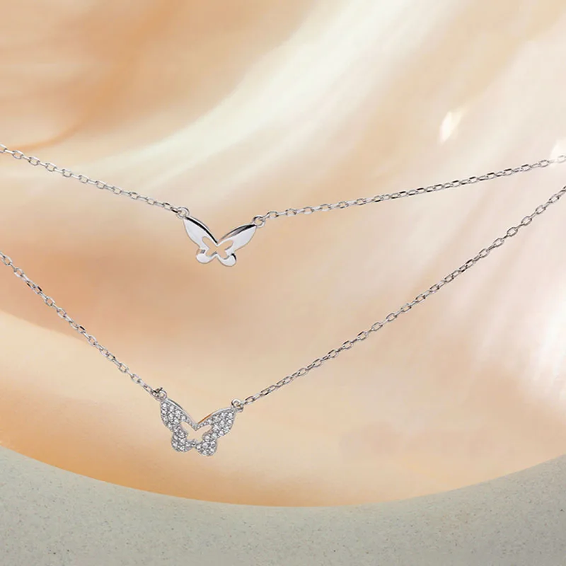 Ожерелье-бабочка женское из серебра 925 пробы, Двухслойное, цепочка до ключиц с фианитом, S-N234