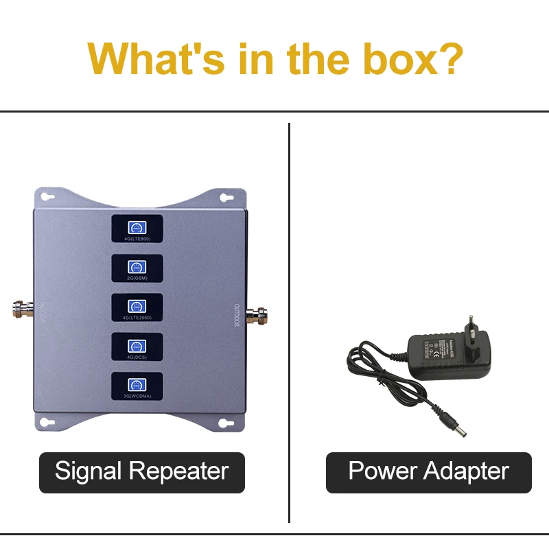 Усилитель сигнала может усилить голос и 2g 3g 4g Интернет для всех европейских стран. Пять Полос Диапазон 20 (LTE 800) Частота восходящего канала: 832-862 МГц/частота нисходящего канала: 791-821 МГц Диапазон 8 (GSM900 UMTS900) Частота восходящего канала: 890-915 МГц/частота нисходящего канала: 935-960 МГц Диапазон 1 (WCDMA2100) Частота восходящего канала: 1920-1980 МГц/частота нисходящего канала: 2110-2170 МГц Диапазон 3 (DCS1800 LTE1800) Частота восходящего канала: 1710-1785 МГц/частота нисходящего канала: 1805-1880 МГц Диапазон 7 (LTE 2600) Частота восходящего канала: 2500-2570 МГц/частота нисходящего канала: 2620-2690 МГц Усиление: 65 дБ