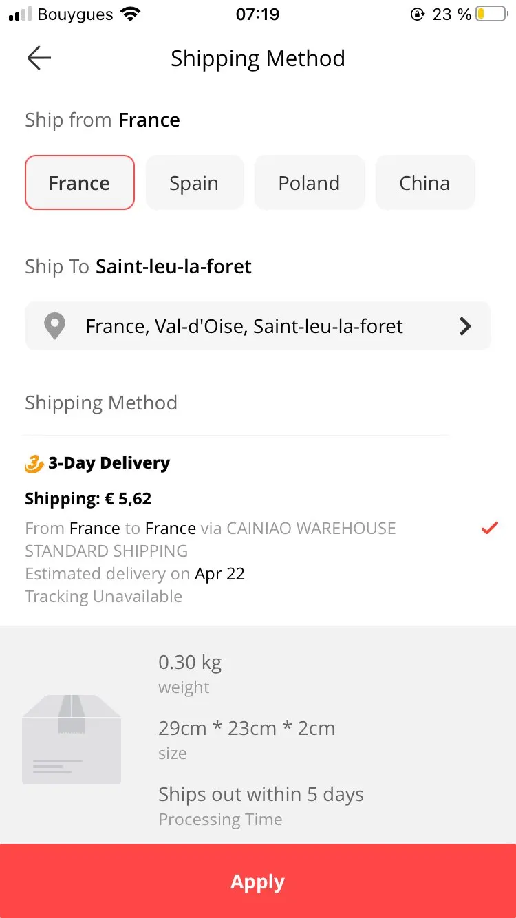 Очень разочарован процессом доставки, потому что я выбрал свой товар, который будет отправлен из Франции 3 дня доставки и 5,44 евро с Ali coins, я получил скидку вместо 0,90-10 дней доставки Из Китая во Францию и мне было сообщено при выборе страны предпочтений, она все равно будет отправлена из Франции, и даже если вы заплатили дополнительную Фпр быструю доставку, потому что мне нужно было путешествовать. Я просто прошу продавца возместить разницу, так как это было не так, как я заказал с доставкой в течение 3 дней, и продавец не был сотрудничать. Я не доволен их обслуживанием, и я чувствую, что они вводят ppl в отправку. Заказал на. 11 апреля 2021 и должен был получить мой товар 14-15 апреля, я получил 26 апреля. Не крутой.