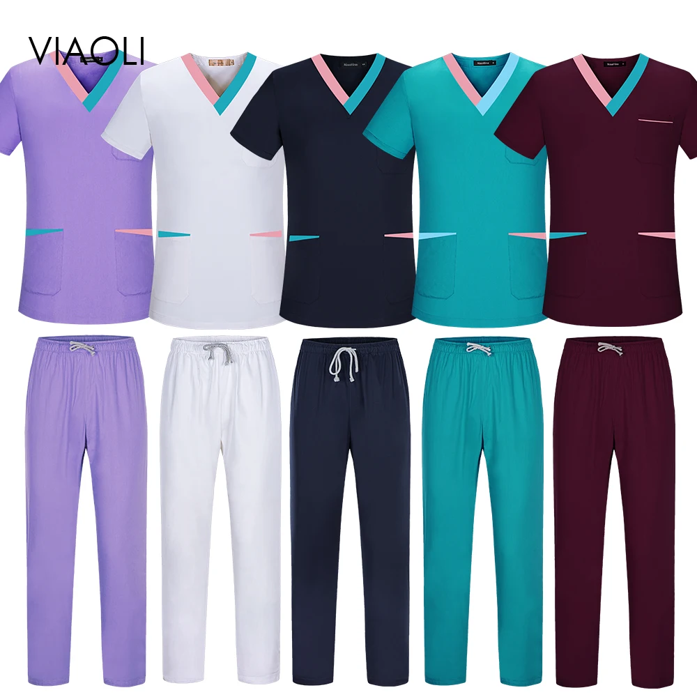Унисекс, оптовые цены, хит продаж, с короткими рукавами, верхняя одежда + штаны, детское нижнее белье здоровья спецодежды костюм лаборатории Рабочая форма v-образный вырез Цвет Блокировка униформа для сотрудниц спа-салонов