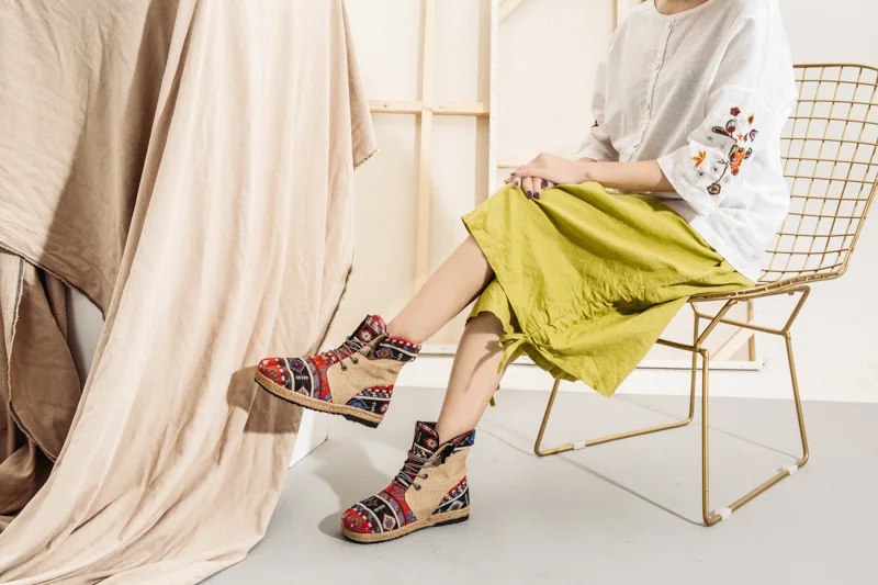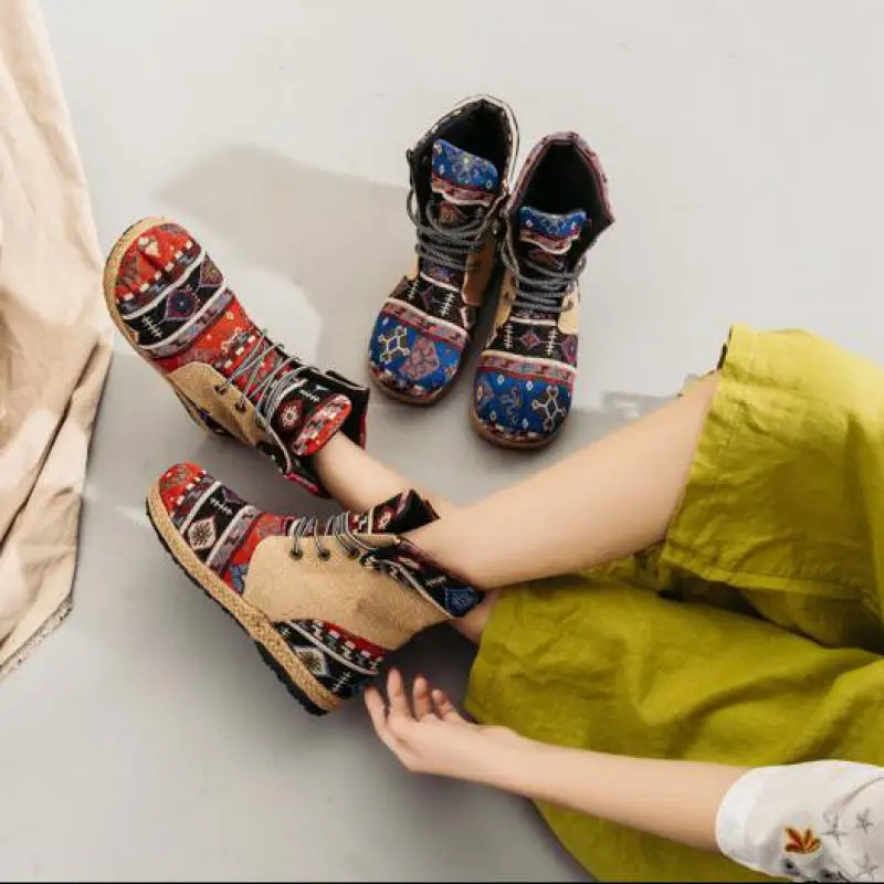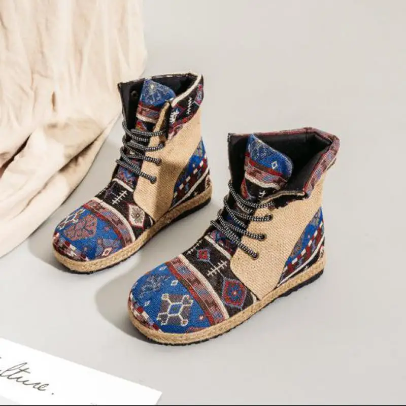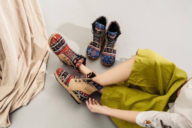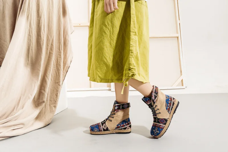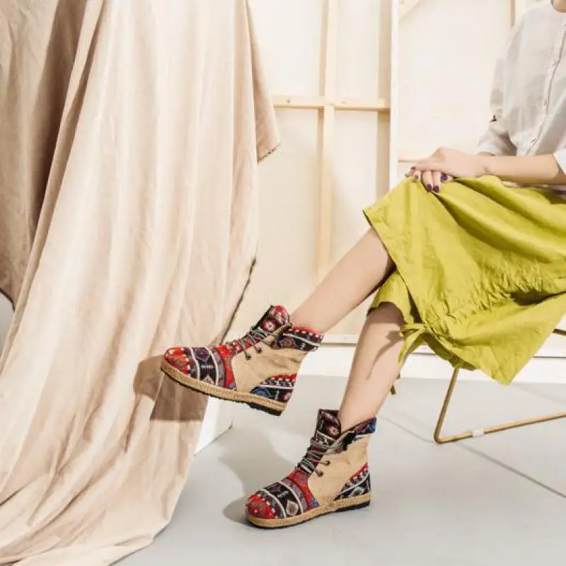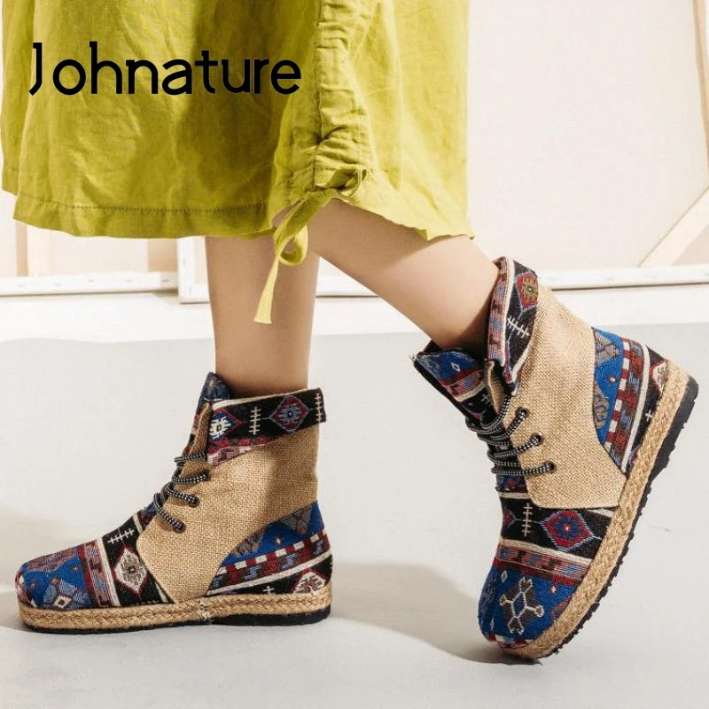 Женские ботинки в стиле ретро Johnature, ботинки из хлопка и льна на плоской подошве, с круглым носком, на шнуровке, в национальном стиле, разные цвета, 2022
