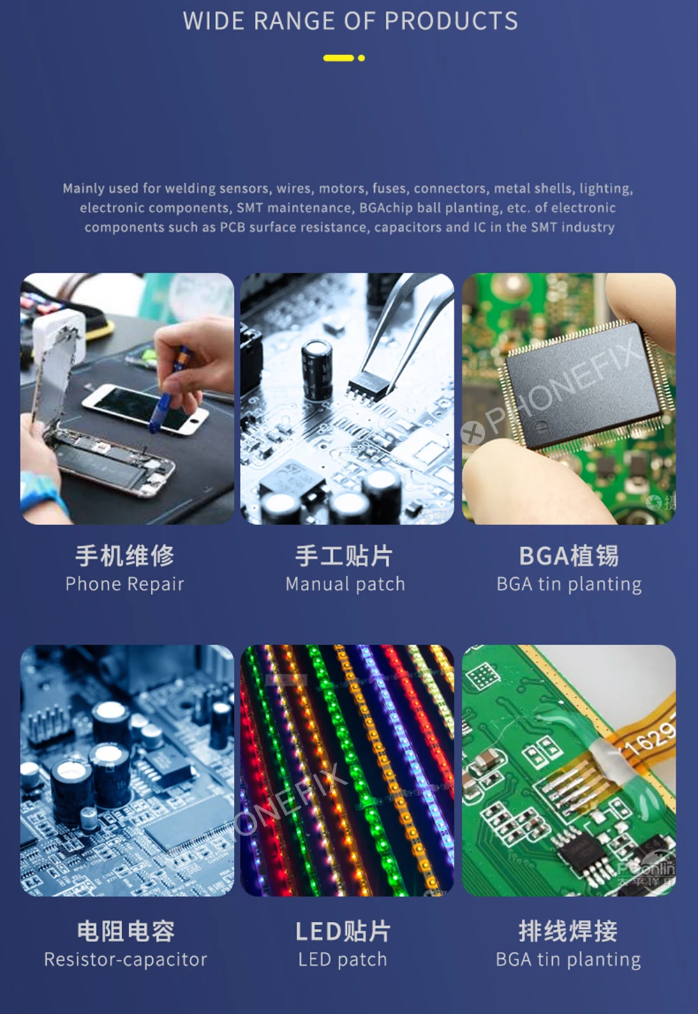 Широкий ассортимент продукции: в основном используется для сварочных датчиков, проводов, моторов, предохранителей, разъемов, металлических корпусов, освещения, электронных компонентов, SMT обслуживания, BGA chip ball Setting и т. Д. Электронных компонентов, таких как поверхностное сопротивление PCB, конденсаторы и IC в SMT промышленности.