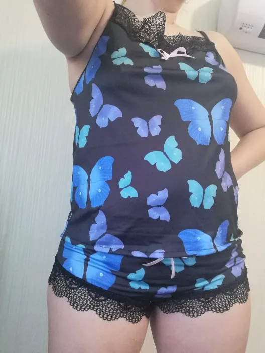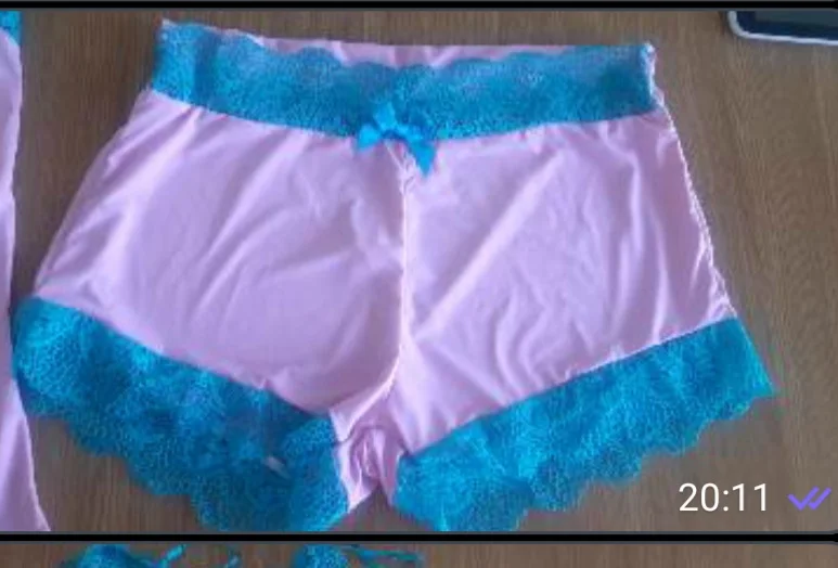Цвет синий. Шорты длиннее, чем на фото, но это не плохо. Материал мягкий, синтетика очень хорошего качества, не колется. Кружево качественное. Заказывала на два размера больше своего, так как люблю посвободнее и отлично угадала. Но кто любит поплотнее, то берите размер в размер - материал хорошо тянется. Доставка быстрее, чем ожидала. Я довольна.С продавцом не общалась. Рекомендую.