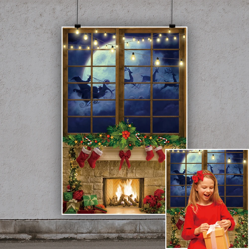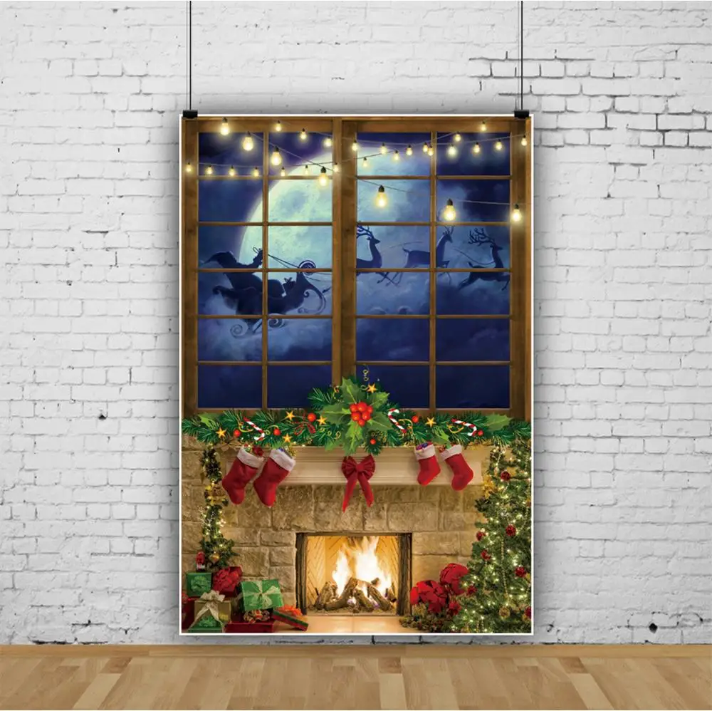 Фотофоны с рождественскими праздниками старым камнем камином носками венком лампочками окном Санта Клаусом вечевечерние сценический фото фон