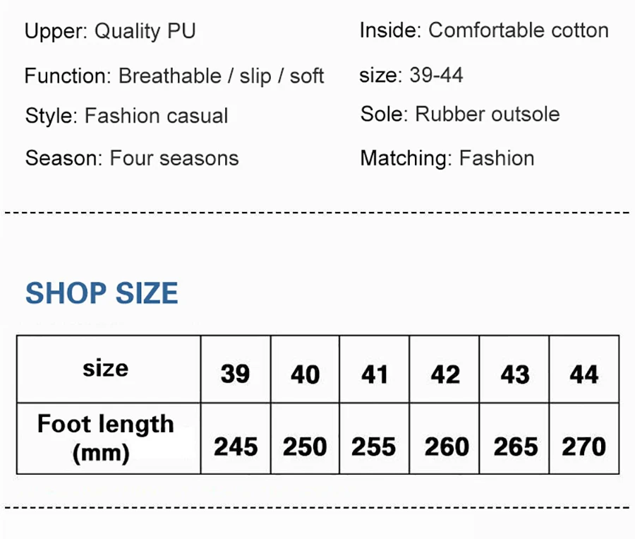 Сначала стойте на ногах, чтобы измерить самую длинную часть, а затем используйте данные о длине стопы, чтобы узнать соответствующий размер обуви в таблице размеров ниже.1. Длина стопы в таблице размеров означает использование этой длины стопы для выбора подходящего размера. Длина стопы не длина стельки, не длина подошвы.2. Пожалуйста, выберите размер в соответствии с длиной Вашей стопы (Не выбирайте размер в соответствии с вашим обычным размером обуви!)3. Из-за различных настроек дисплея и угла съемки цвет может немного отличаться от реального.