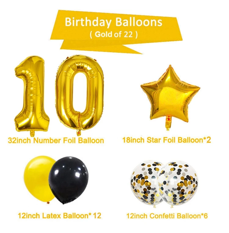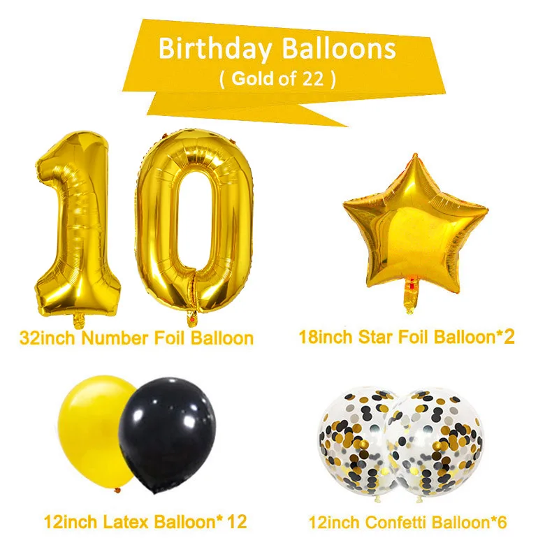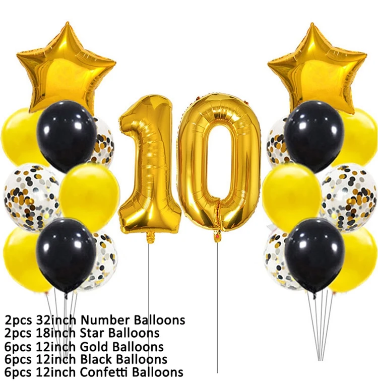 Шары из фольги 10 для 10 лет, украшение для дня рождения, 10 лет, золотистые, черные, на годовщину