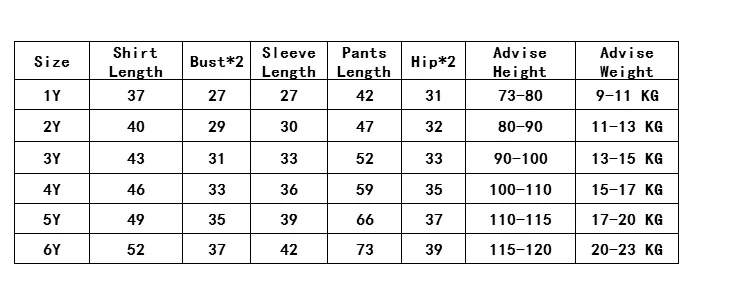 ● Продукт Размеры: 1Y-2Y-3Y-4Y-5Y-6Y