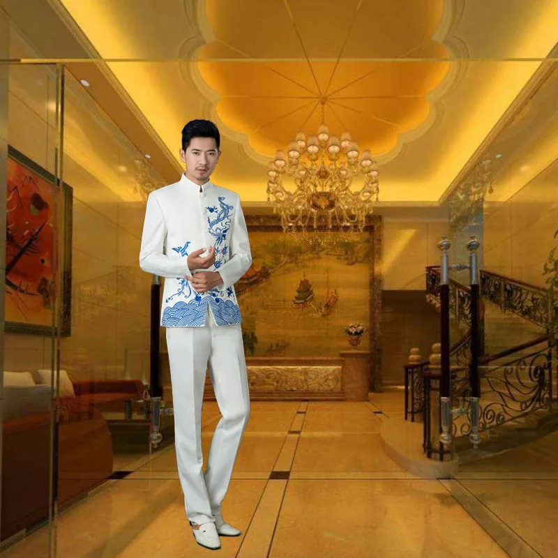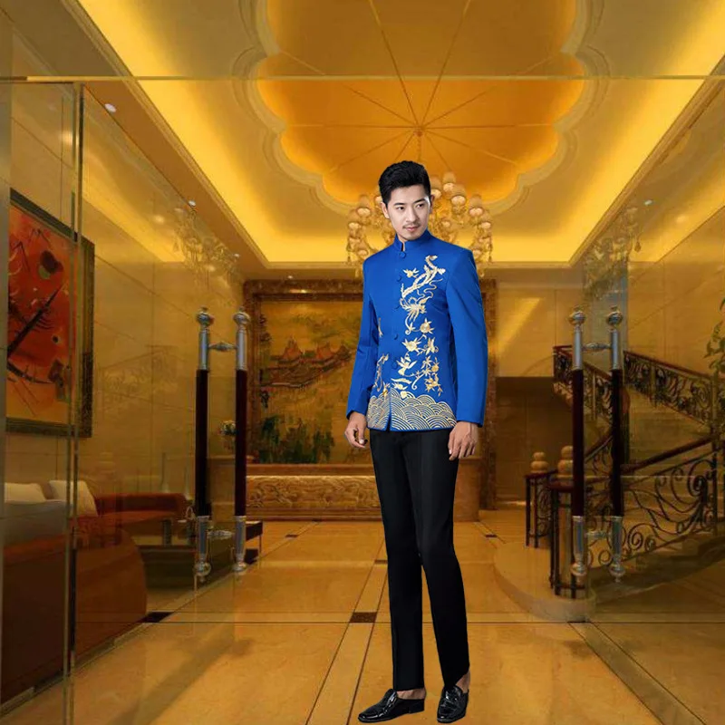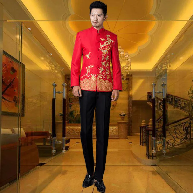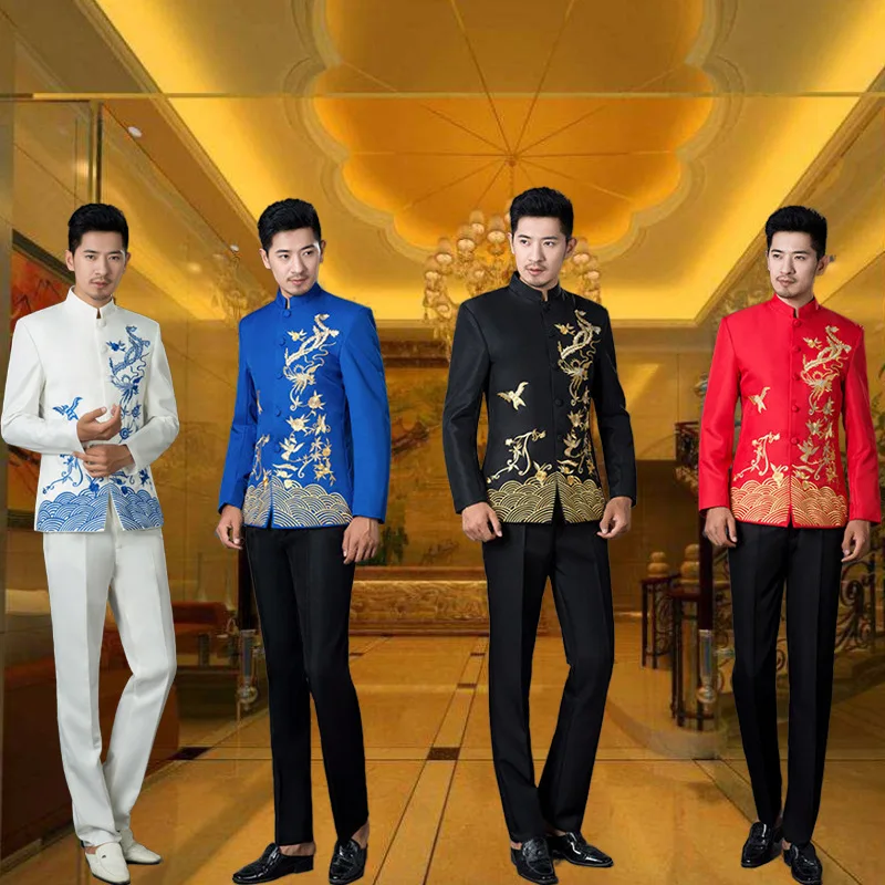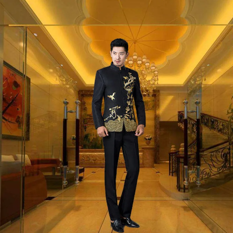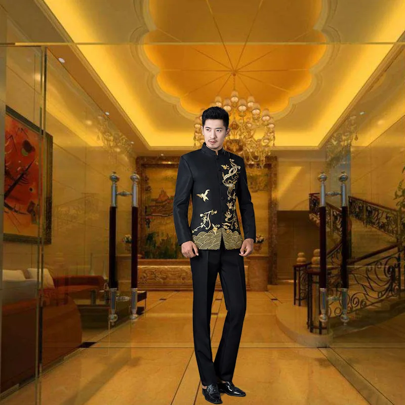 Мужские костюмы со стоячим воротником, сценические костюмы, пиджак с китайской туникой, блейзер, платье в стиле Звезд для танцев, черный