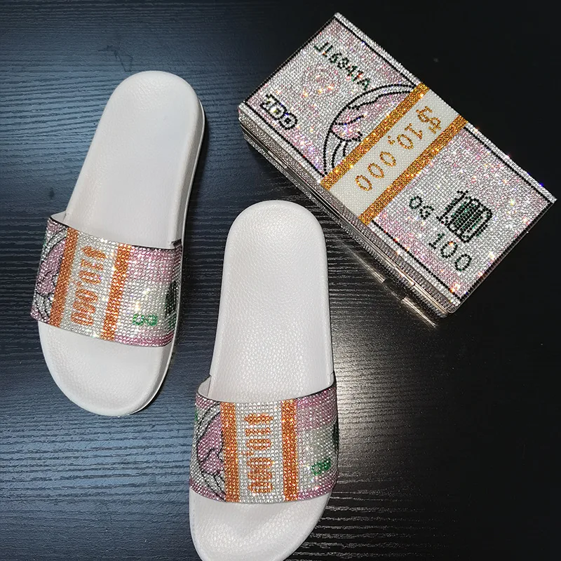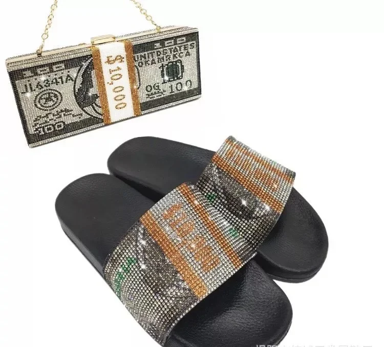 Шлепанцы женские в стиле доллар, стразы и сумка, Нескользящие, модные, блестящие, универсальные, мягкие, на плоской подошве