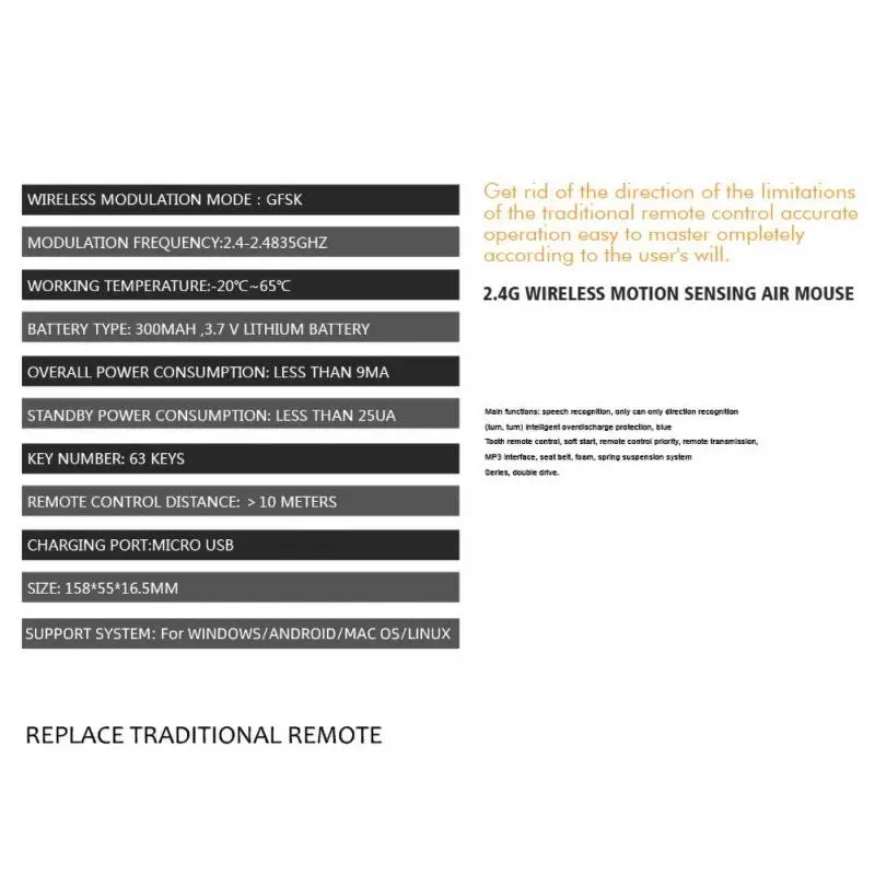 Мини Беспроводная клавиатура Air Mouse IR пульт дистанционного управления для Android TV Box Компьютер беспроводной пульт дистанционного управления многофункциональная клавиатура Характеристики: Портативный и легкий, удобный для захвата. 2,4 ГГц Беспроводная технология, анти-помех соединения. Поставляется с usb-приемником, подключи и работай, прост в эксплуатации. Подходит для smart TV, для Android TV Box, для ПК/HTPC, проекторов, компьютеров и т. д. Название товара: Беспроводная Клавиатура Материал: АБС-пластик Режим беспроводной модуляции: GFSK Частота модуляции: 2,4-2,4835 ГГц Рабочая температура: от-20 до 65 градусов Цельсия Тип батареи: 3,7 V/300 мА/ч, Перезаряжаемые батареи (в комплекте) Общая потребляемая мощность: <15 мА Потребляемая мощность в режиме ожидания: 25uA Количество клавиш: 57 клавиш Дистанция дистанционного управления: >10 метров Порт зарядки: Micro USB Характеристики: беспроводной, пульт дистанционного управления, многофункциональный Размеры: 15,8 см x 5,5 см x 1,65 см/6,22 "x 2,17" x 0,65 "(прибл.) Примечания: Благодаря светильник и экрана Цвет Товара может быть s светильник ly отличается из-за характеристик монитора компьютера. Возможны незначительные отклонения в размерах из-за различных измерений вручную. Посылка включает в себя: 1 x беспроводная клавиатура 1 usb-приемник 1 x зарядный кабель