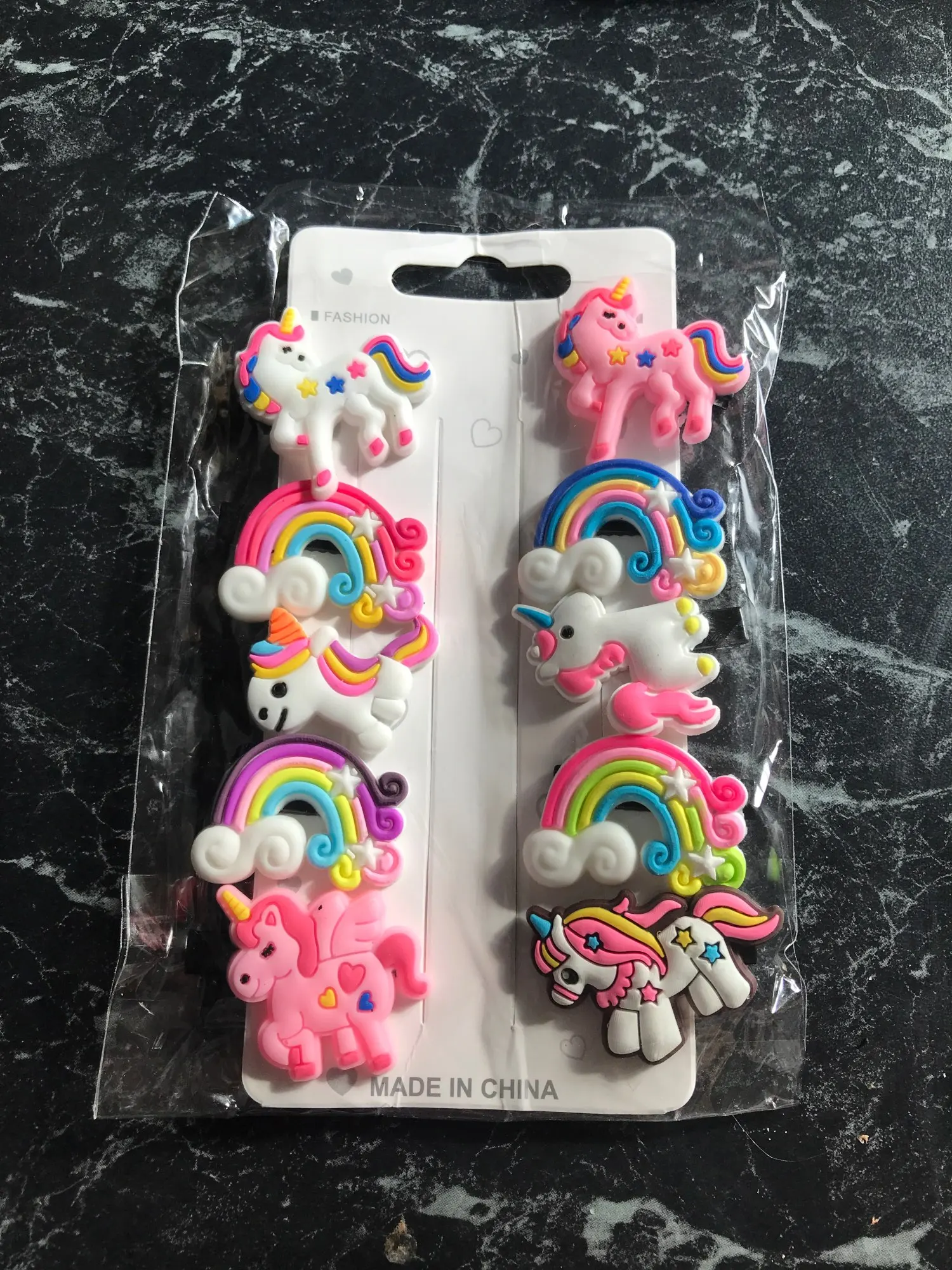До Волгограда дошло за две недели, заказ не отслеживался, заколочки хороши почти без запаха, дочка довольна, советую к покупке.