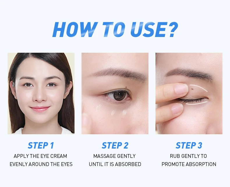 ▶Как использовать Шаг 1: Равномерно нанесите крем для глаз вокруг глаз; Шаг 2: мягко массируйте, пока он не впитывается; Шаг 3: аккуратно протрите, чтобы повысить поглощение.
