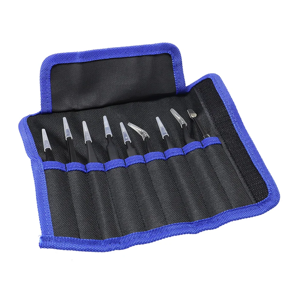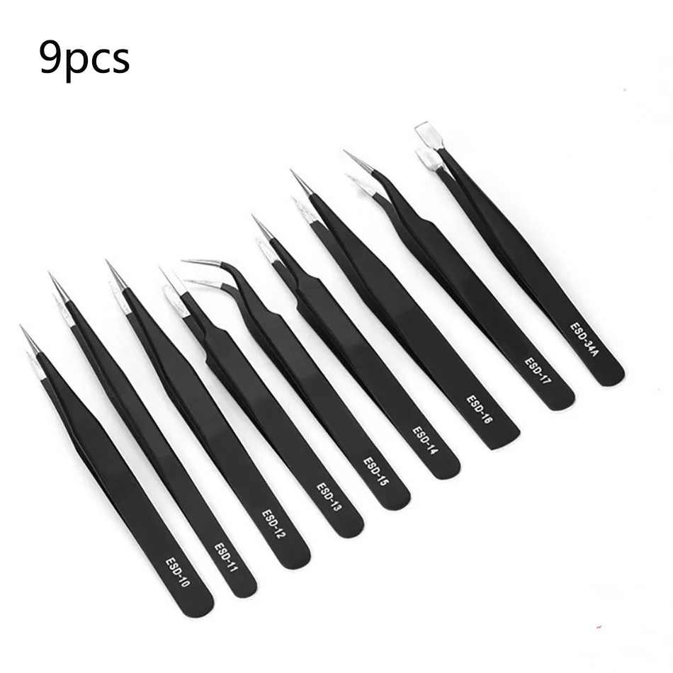 Набор антистатических пинцетов из нержавеющей стали ESD, инструменты для технического обслуживания, точные изогнутые и прямые ремонтные инструменты, 9 шт.
