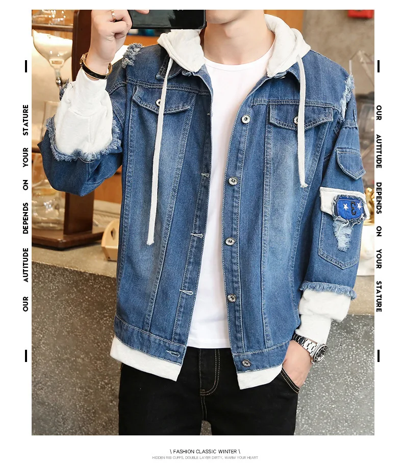 Куртка мужская джинсовая приталенная с капюшоном, модная уличная од...