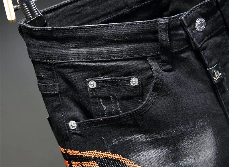 Джинсы мужские прямые в европейском стиле, брендовые узкие брюки из денима, байкерские штаны с черепами и дырками, черные