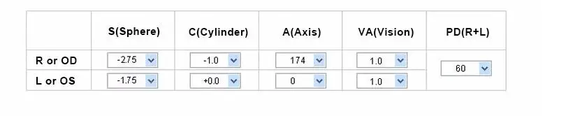 Астигматизм: 1. Степень левого/правого глаза 2. Расстояние зрачка 3. Астигматизм левого/правого глаза 4. Астигматическая ось