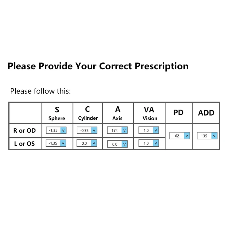 Абсолютно влюблен в этого продавца. Мы смогли исправить ошибку с рецептурными линзами, если продавец отправил правильный рецепт. Теперь я могу использовать оправы с рецептами, которые для меня. Я за луной в том, как любезно и с пониманием относится к этому продавцу. Я рекомендую каждый день!